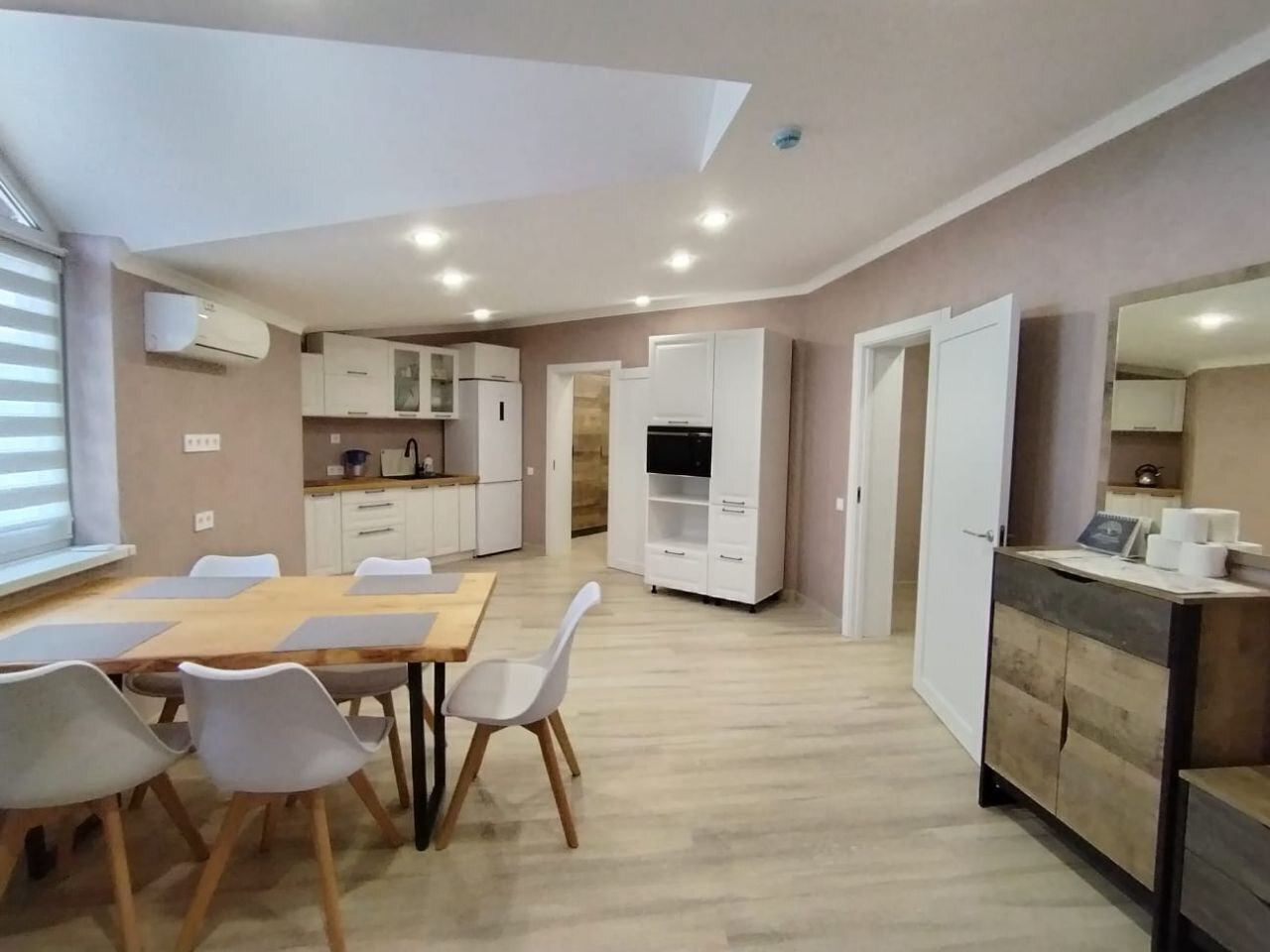 Просторные апартаменты включают два стильных санузла, один из которых оснащён стиральной машиной. В Вашем распоряжении два современных телевизора, которые позволят насладиться любимыми программами и фильмами в любой части номера. Три мощных кондиционера поддерживают идеальную атмосферу и комфорт в каждой комнате. Кухня оборудована всем необходимым: от современной плиты до вместительного холодильника и полного набора кухонных принадлежностей. Для отдыха предусмотрены две двуспальные кровати и двуспальный диван, обеспечивающие уют и расслабление.