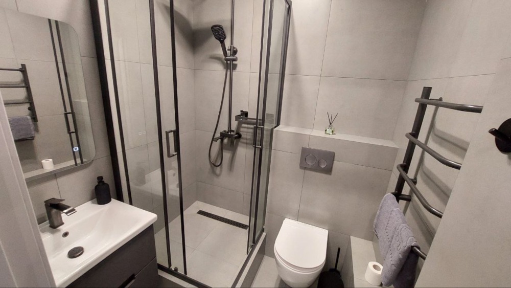 Ванная комната с душем и всеми средствами гигиены.