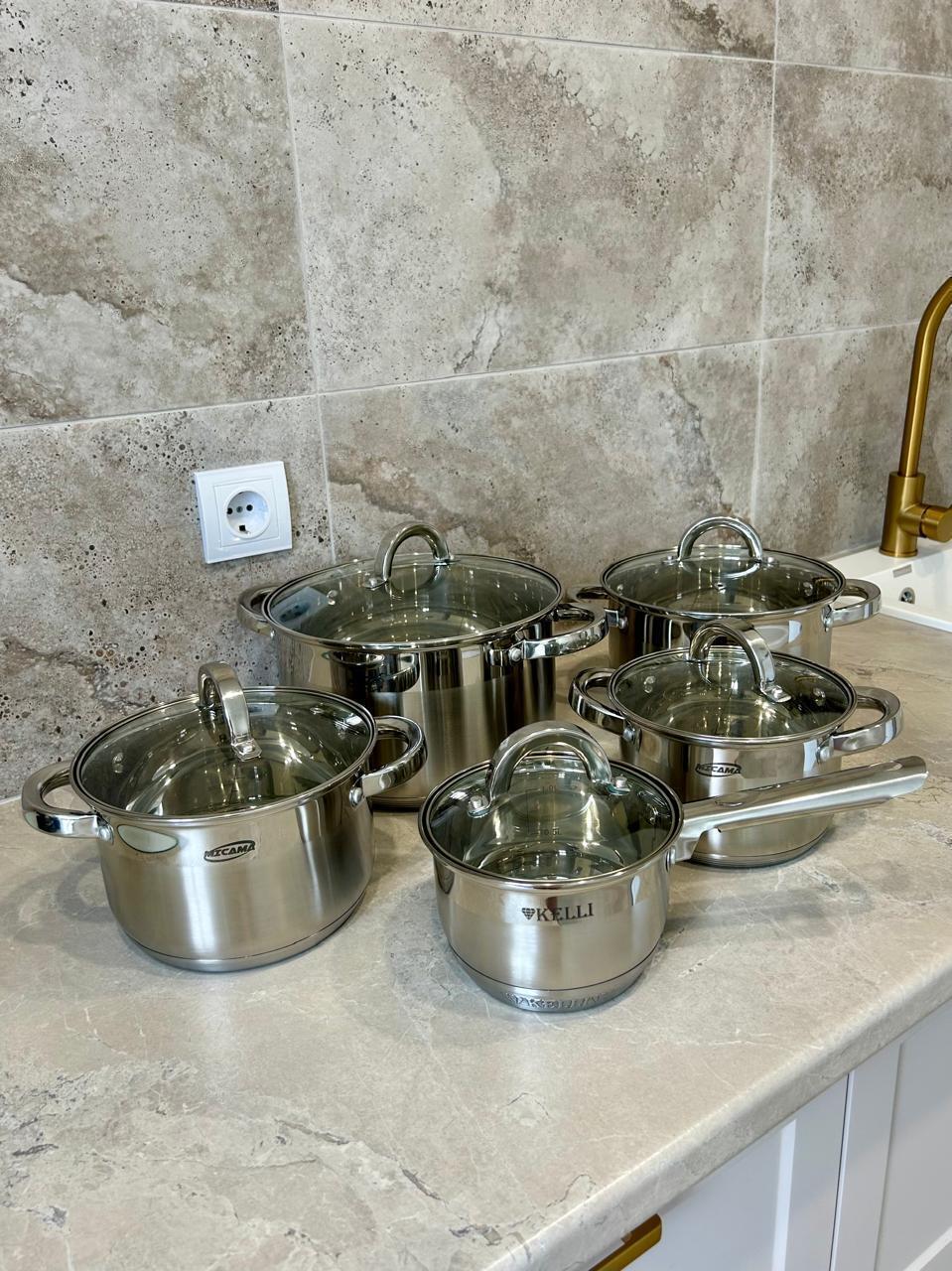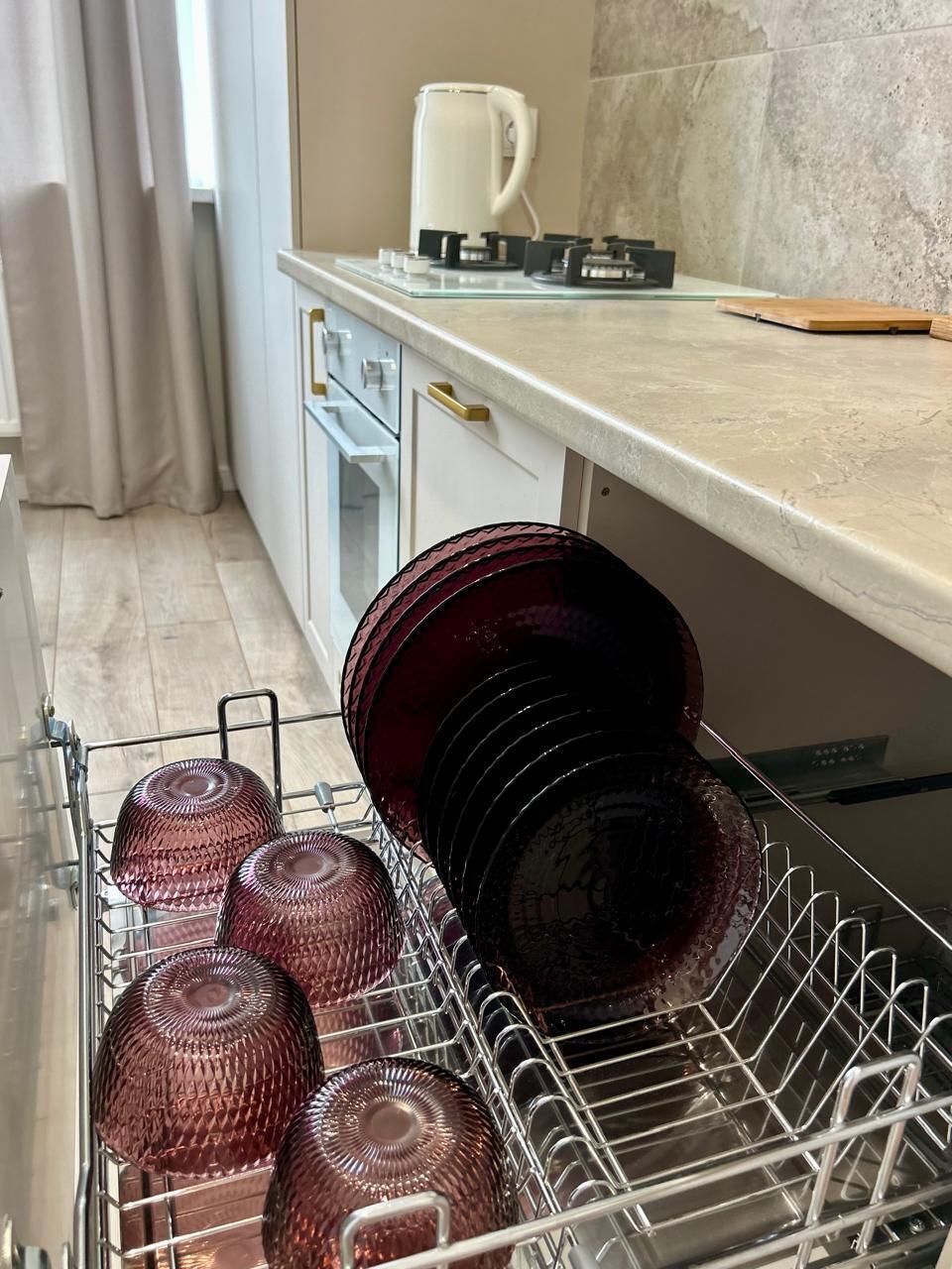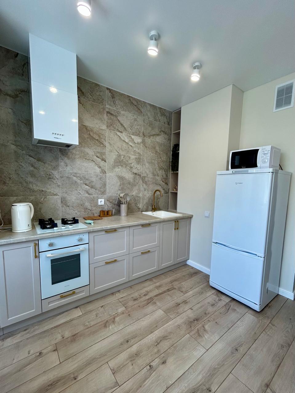 На кухне современная удобная мебель, холодильник, микроволновка, газовая варочная панель, духовой шкаф, электрочайник, вся посуда для приготовления, набор посуды, бокалов, столовых приборов.