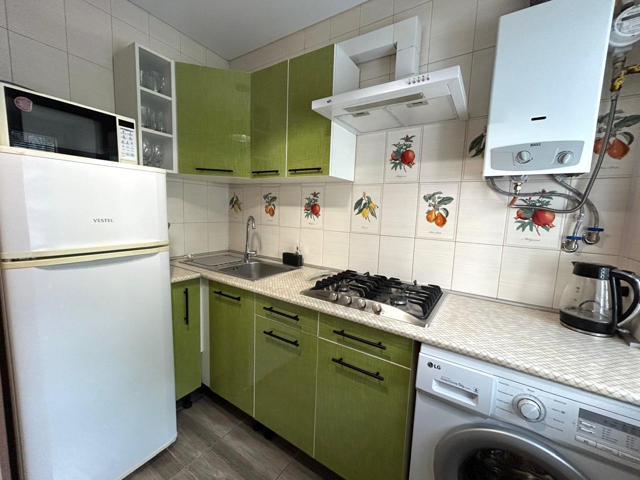 Кухня оснащена: современная мебель, холодильник, микроволновка, газовая варочная поверхность, электрочайник, вся посуда для приготовления, набор посуды, бокалов, столовых приборов.