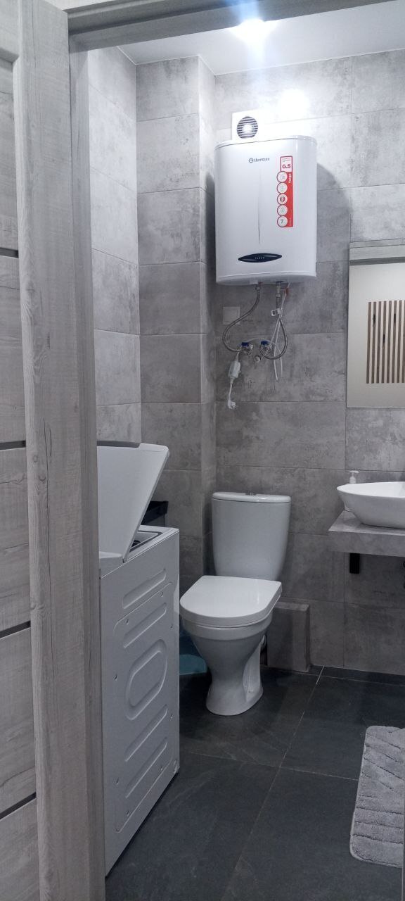 В санузле - средства гигиены (шампунь, гель для душа, зубная щётка и паста).