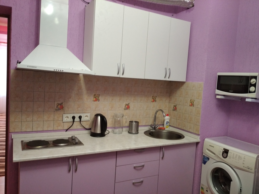Кухня с электрической плитой, холодильником, микроволновой печью, электрочайником, необходимой посудой, холодной и горячей водой (постоянно).