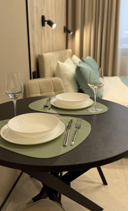 В квартире есть все, что может понадобиться для приготовления еды. Также есть вся посуда для комфортного проживания: ножи, столовые приборы на 2 человека, кастрюля, сковородка, тарелки, бокалы и многое другое включено, если снять студию у нас.