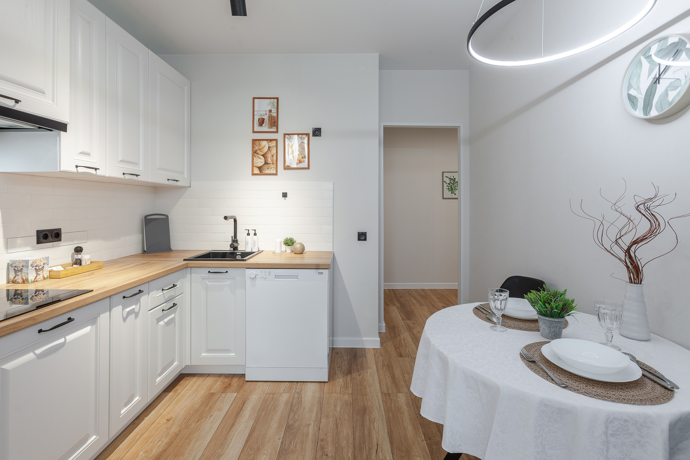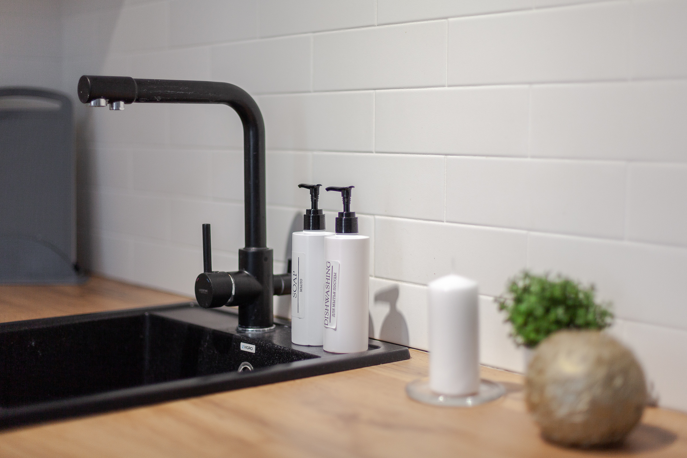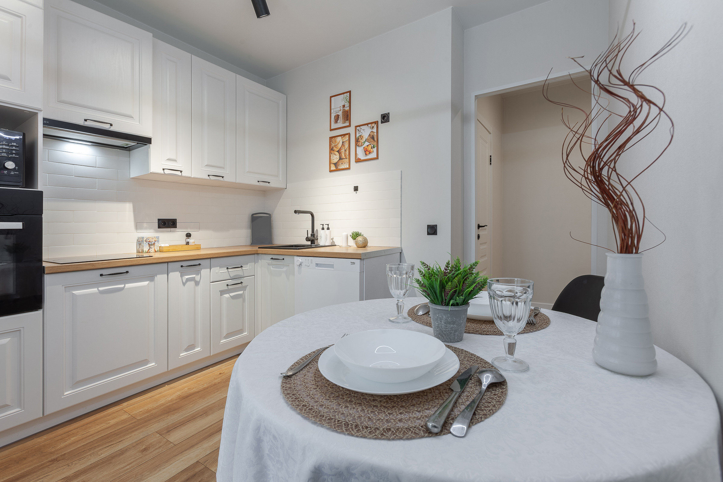 - вся бытовая техника (электроплита + вытяжка, электрический чайник, микроволновая печь, холодильник);