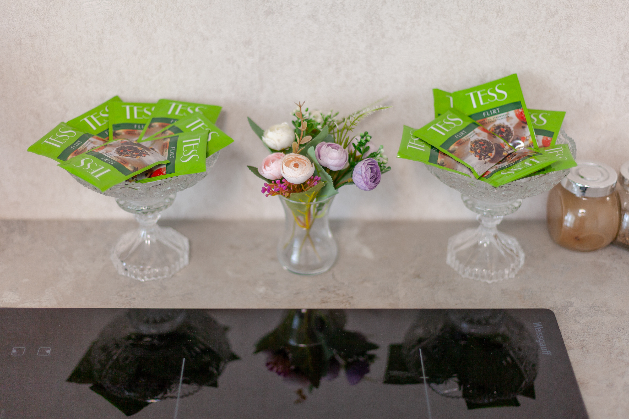 - вся бытовая техника (электроплита + вытяжка, электрический чайник, микроволновая печь, холодильник);