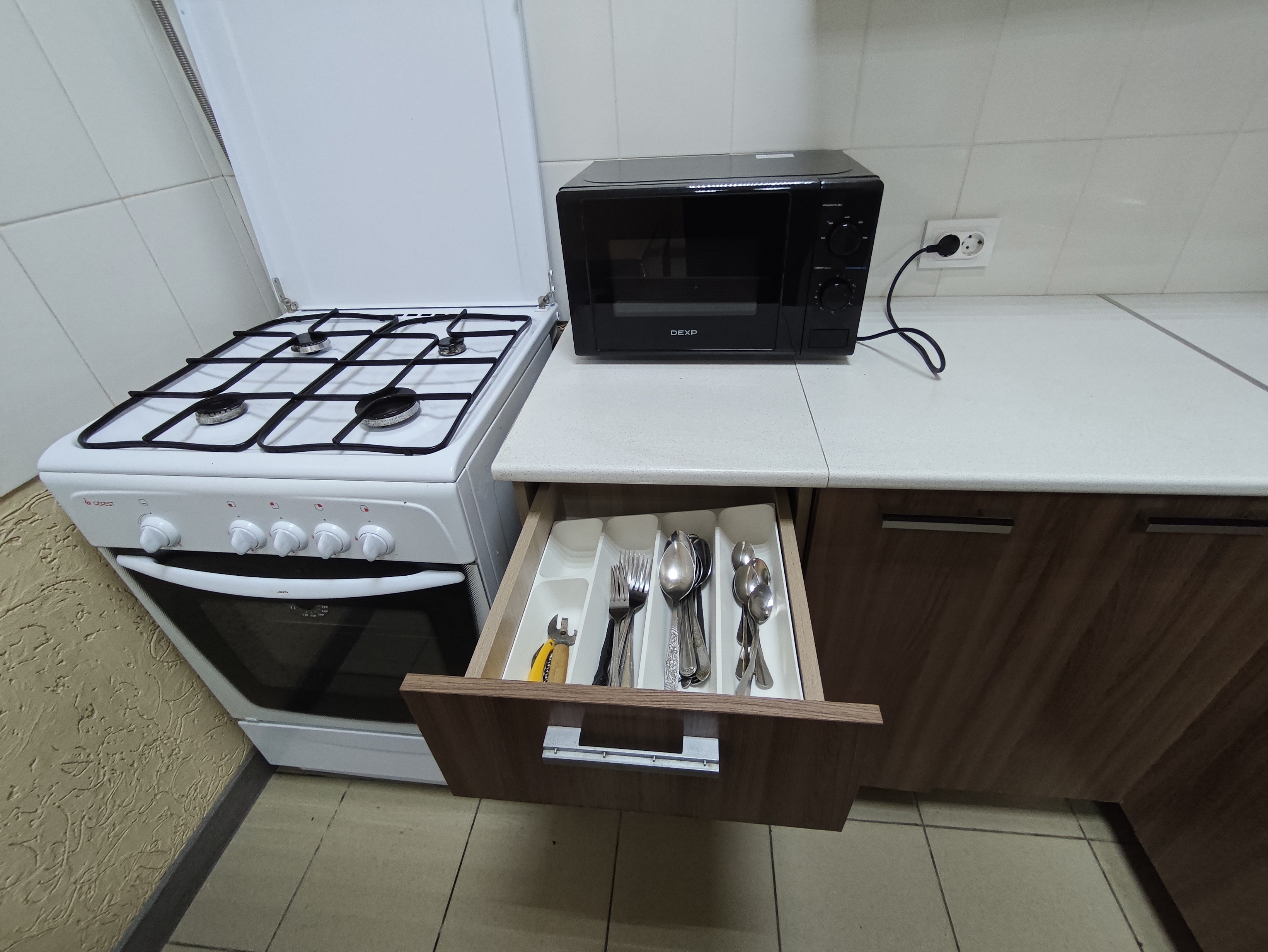 Полная кухня: печка чайник, микроволновка, посуда.