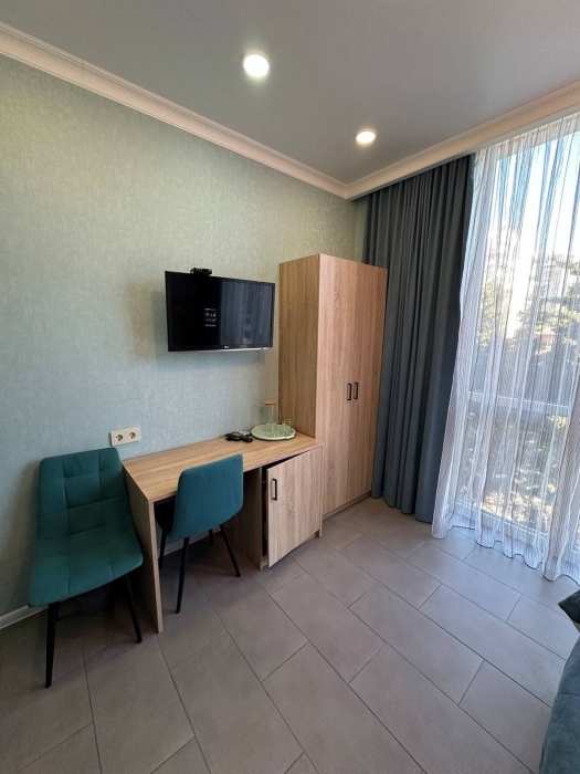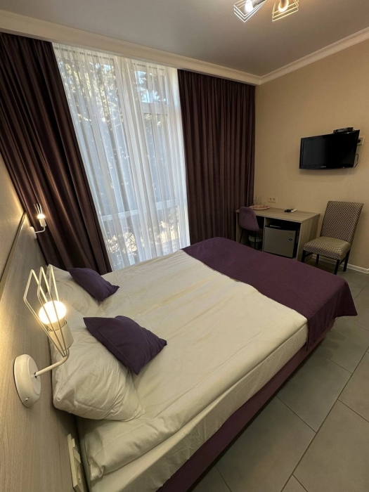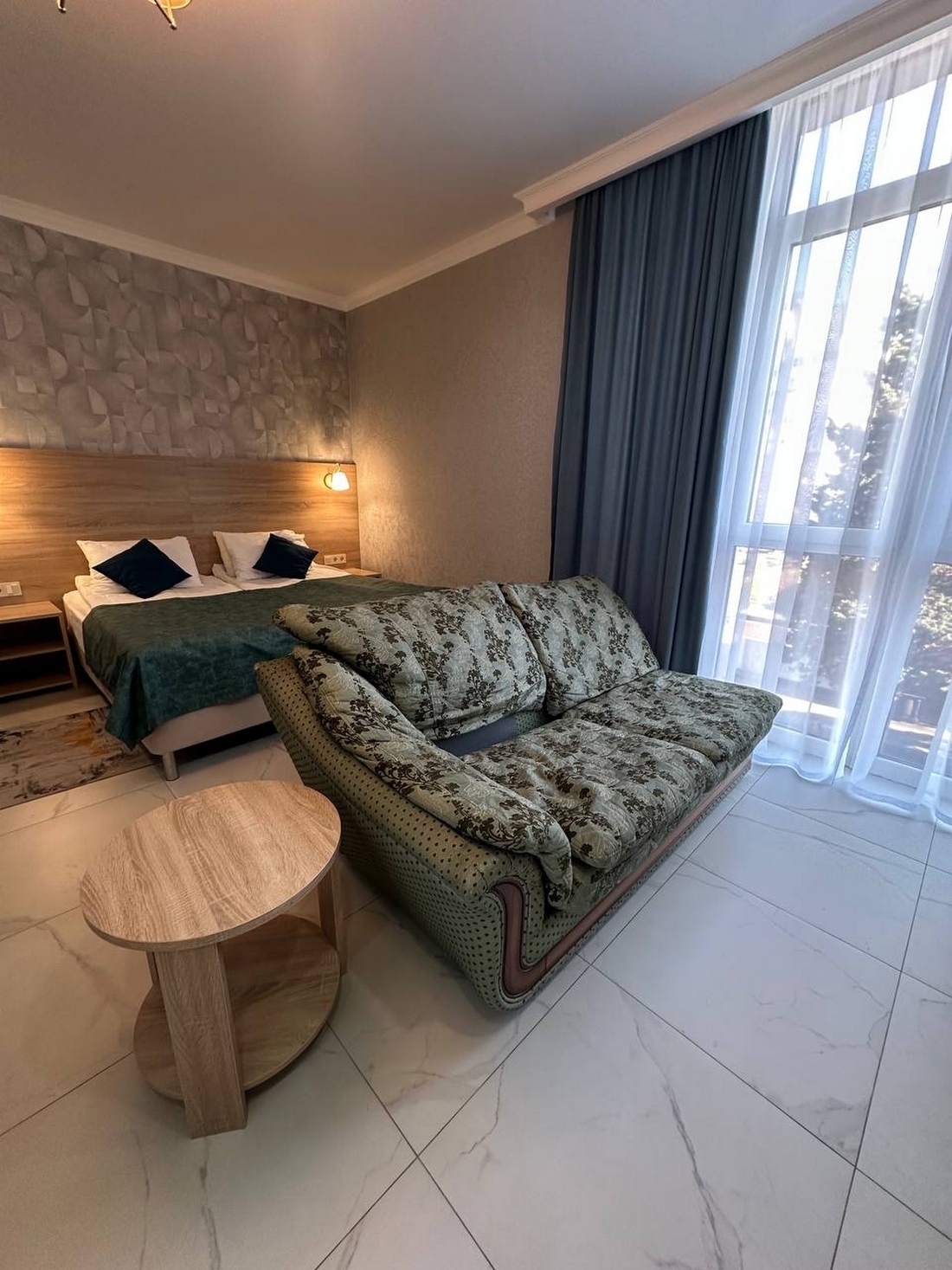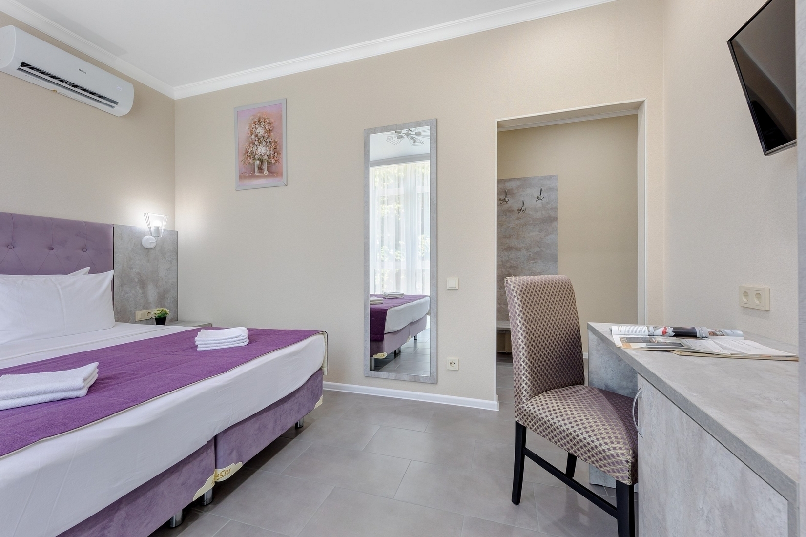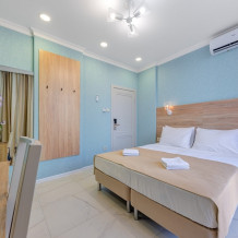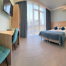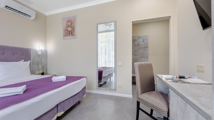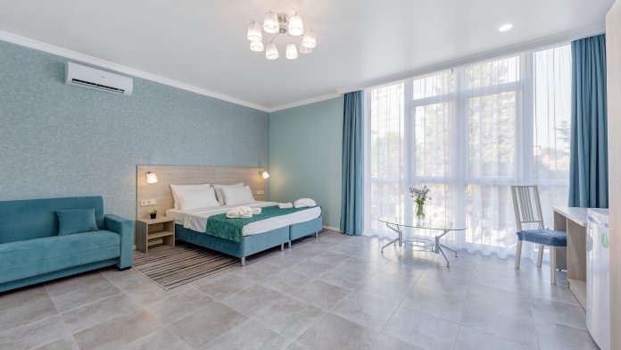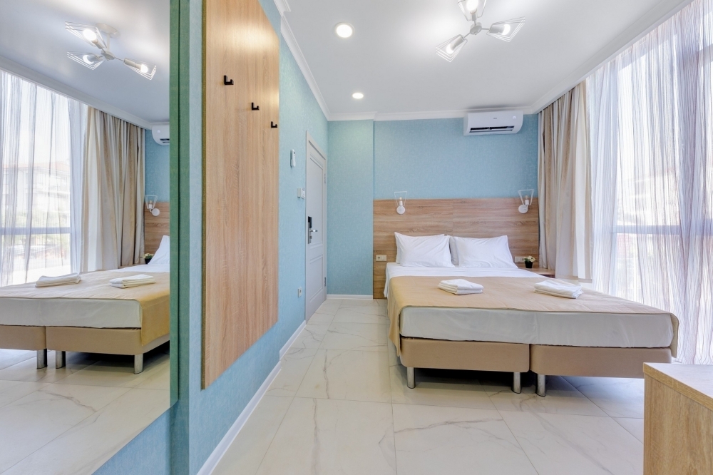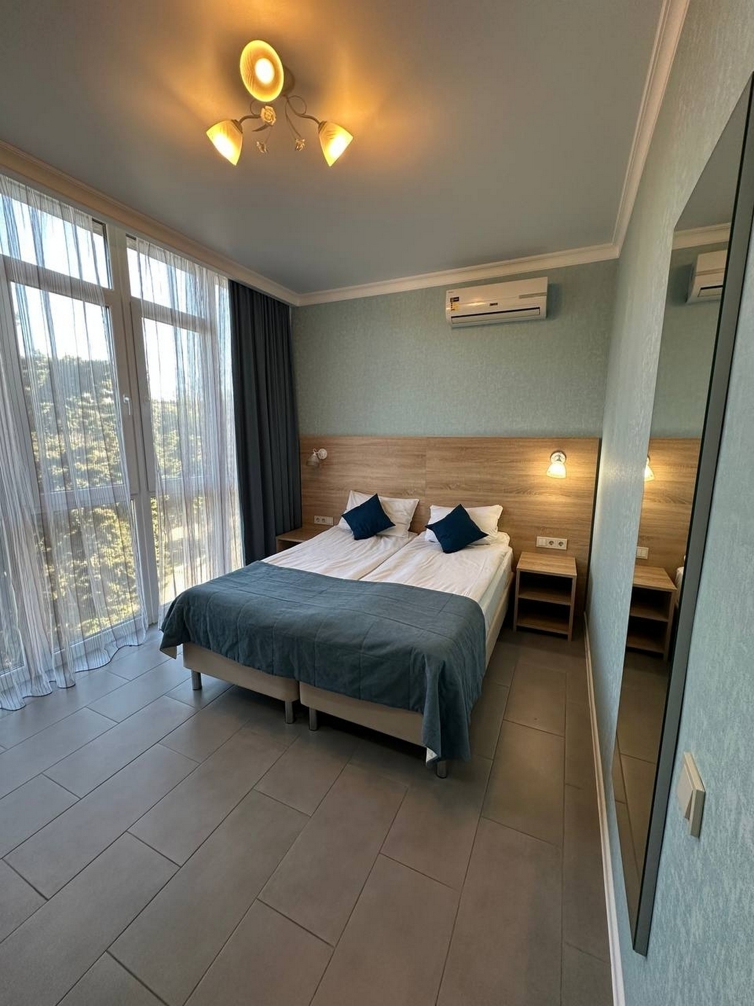 Имеет спальню с приятным интерьером. В номере: 1 двуспальная и 1 односпальная кровати. Имеется телевизор, кондиционер, шкаф, вешалка, зеркало, журнальный столик, фен, стулья. Индивидуальная ванная комната: душ, раковина, туалет.