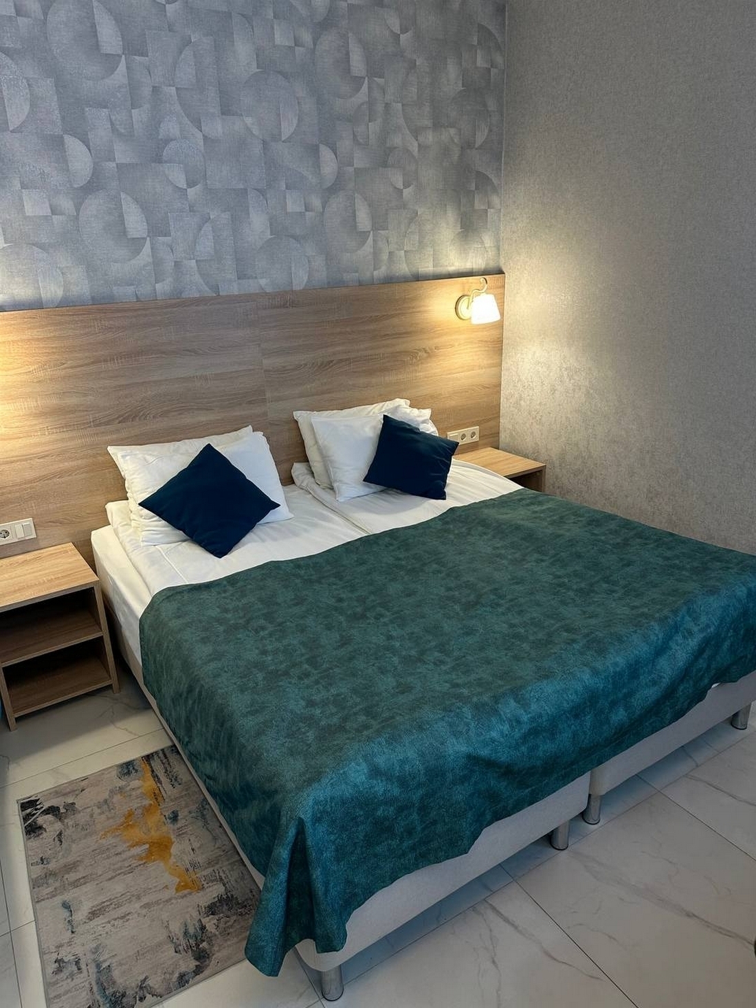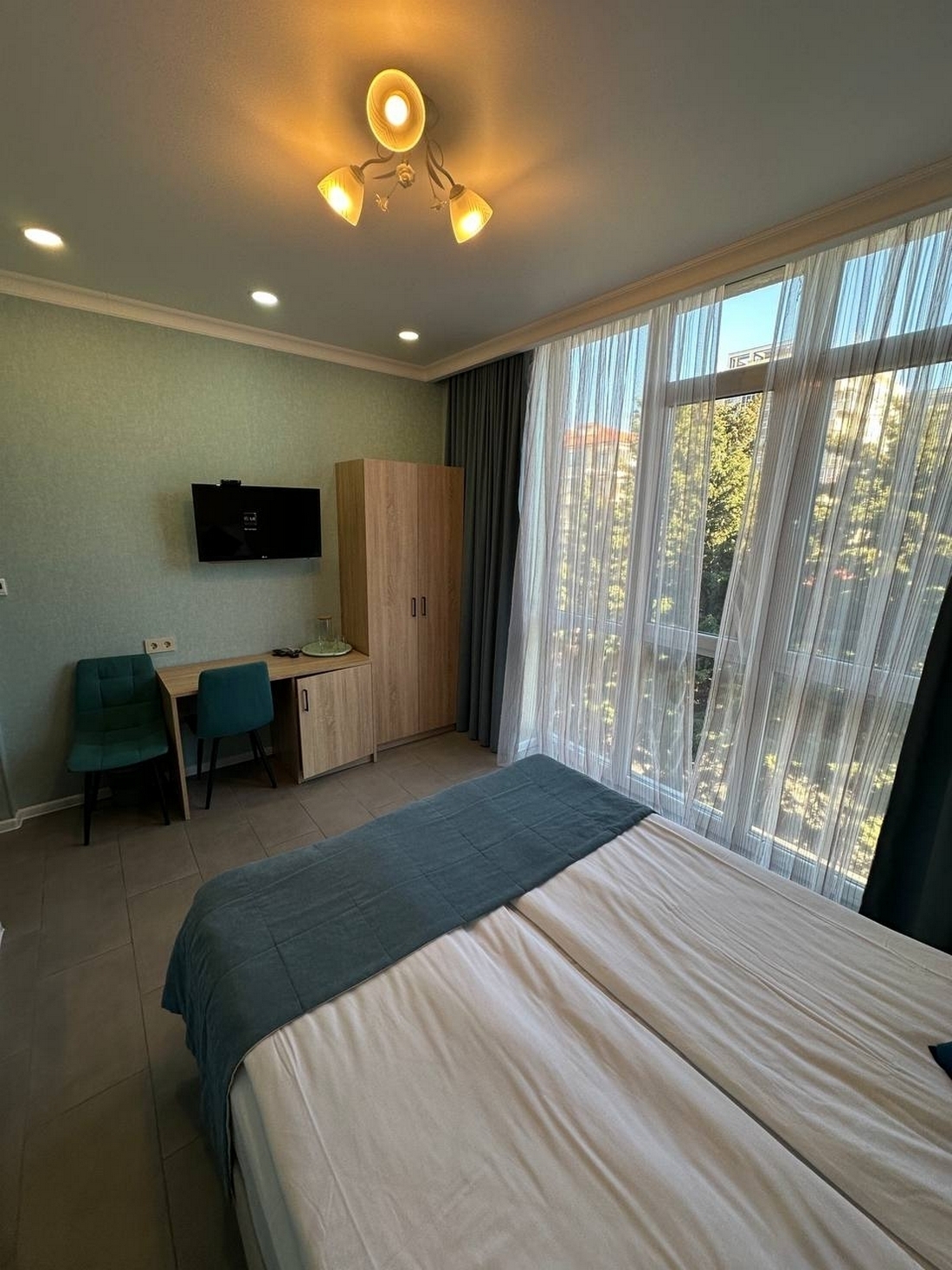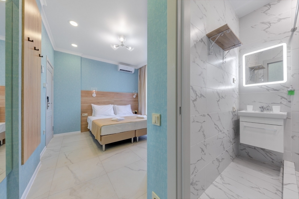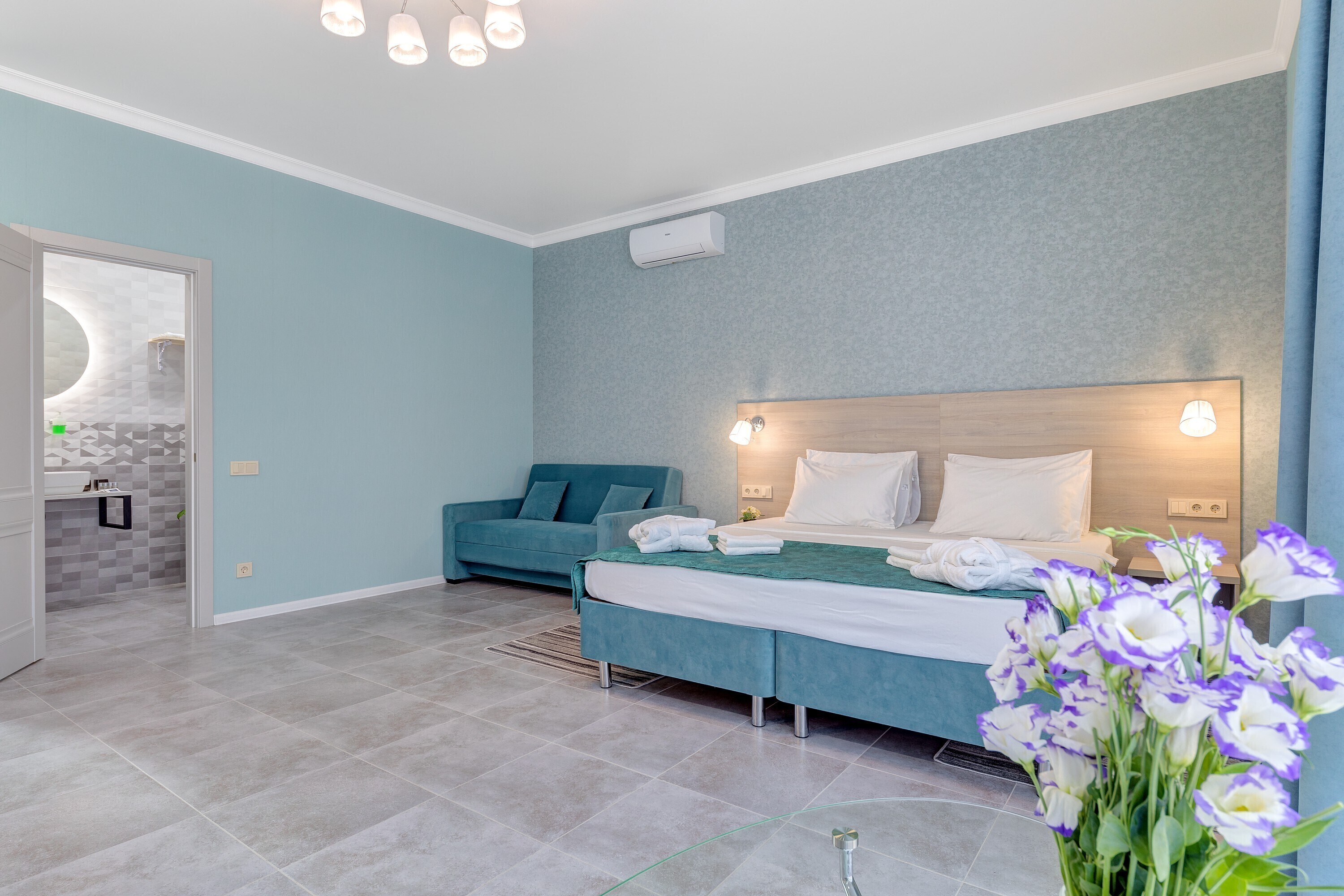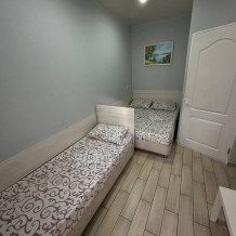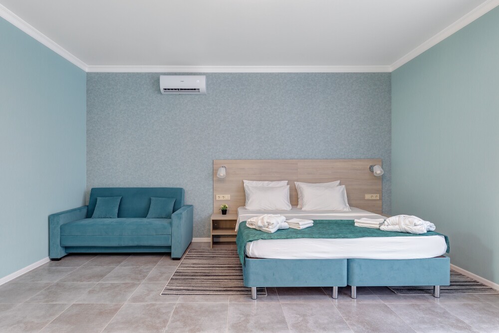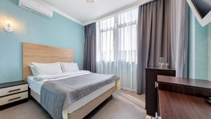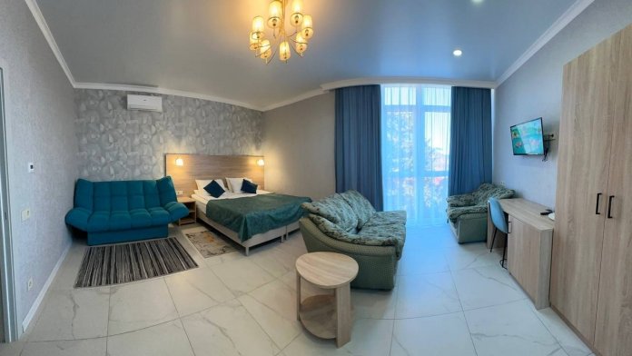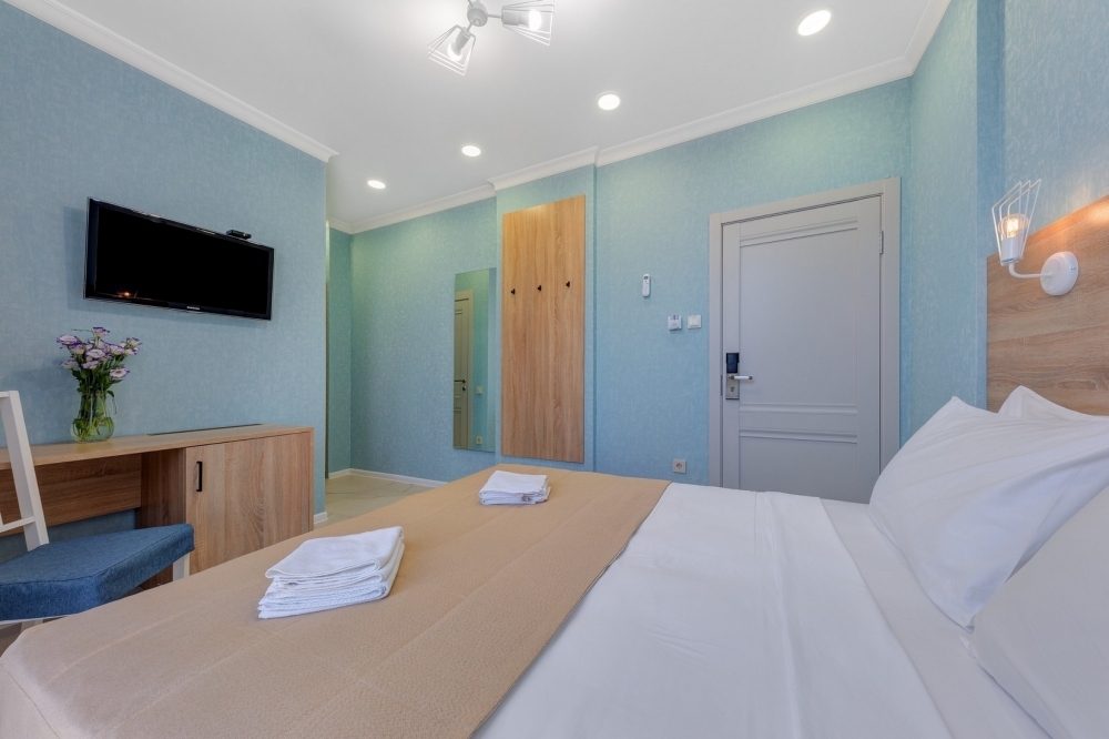 Имеет спальню с приятным интерьером. В номере: 1 двуспальная и 1 односпальная кровати. Имеется телевизор, кондиционер, шкаф, вешалка, зеркало, журнальный столик, фен, стулья. Индивидуальная ванная комната: душ, раковина, туалет.