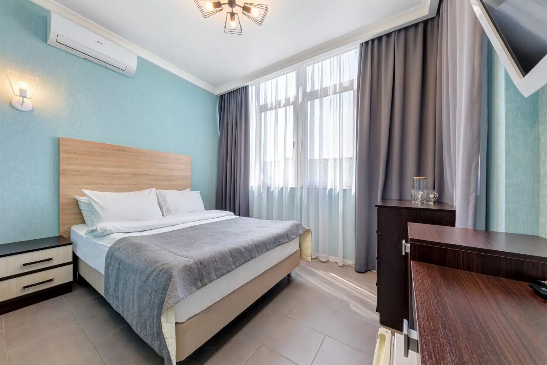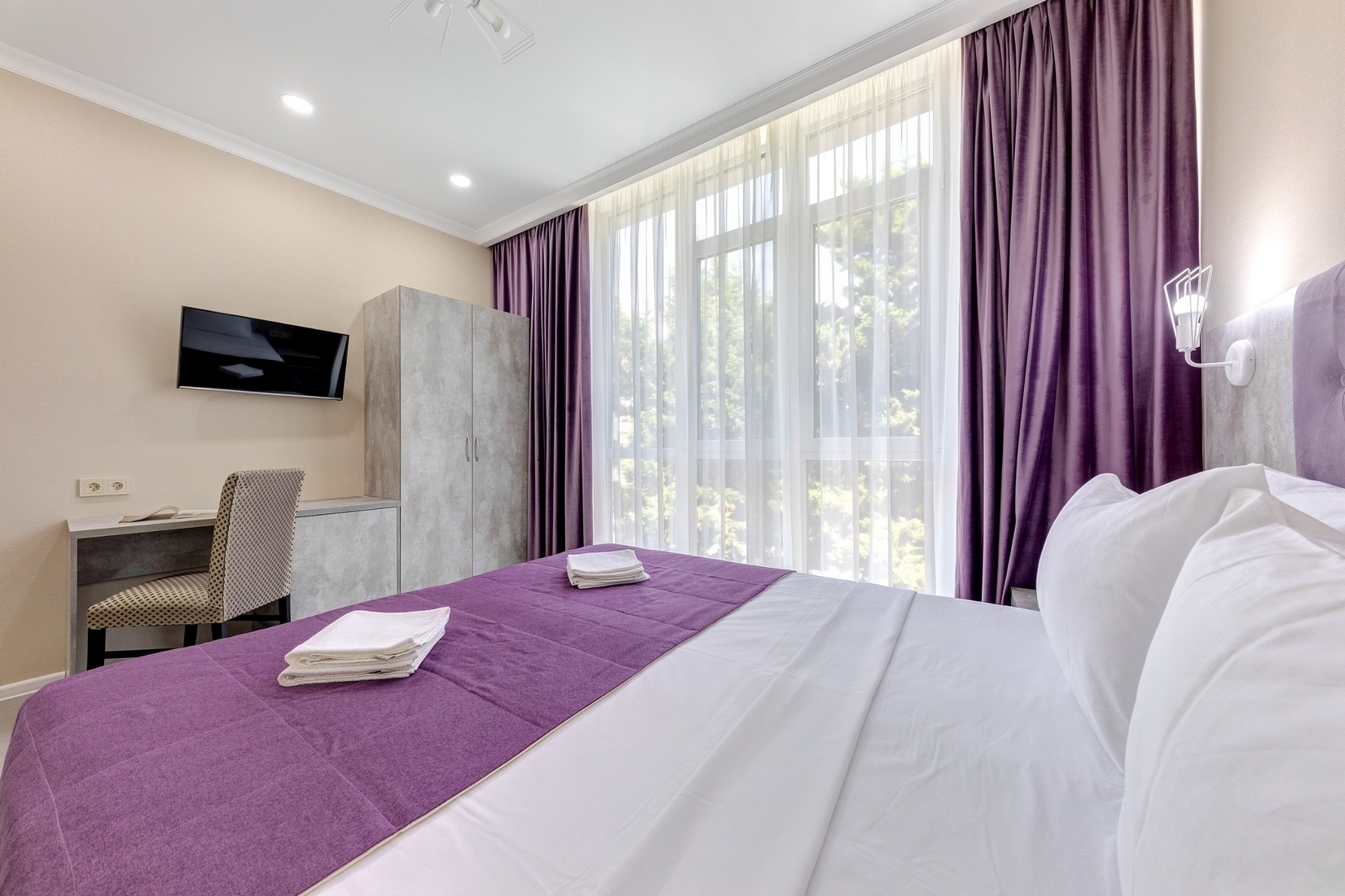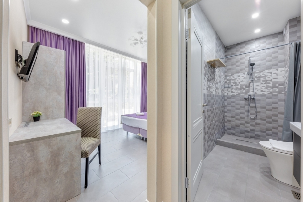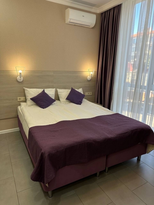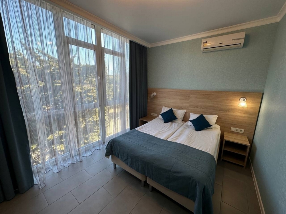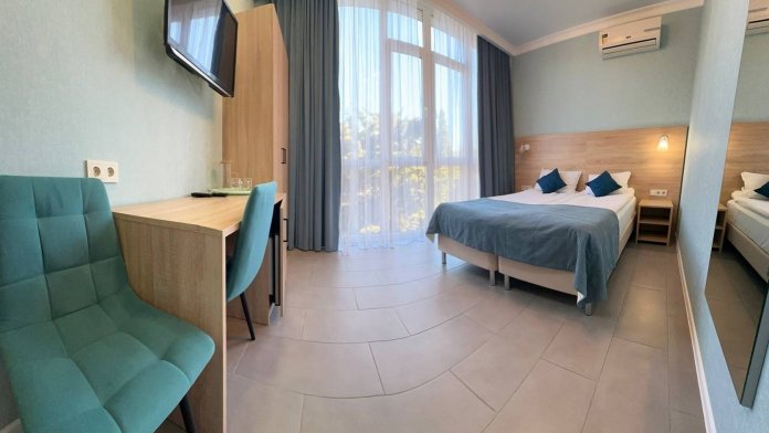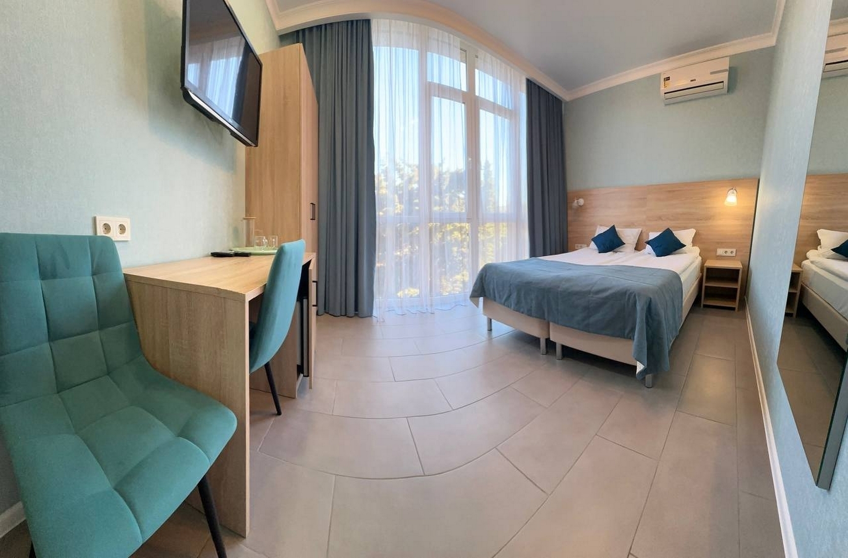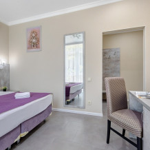 Имеет спальню с приятным интерьером. В номере: 1 двуспальная и 1 односпальная кровати. Имеется телевизор, кондиционер, шкаф, вешалка, зеркало, журнальный столик, фен, стулья. Индивидуальная ванная комната: душ, раковина, туалет.