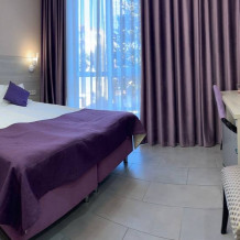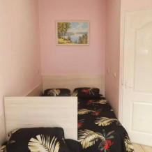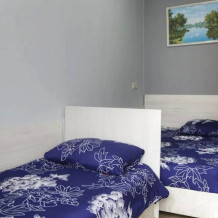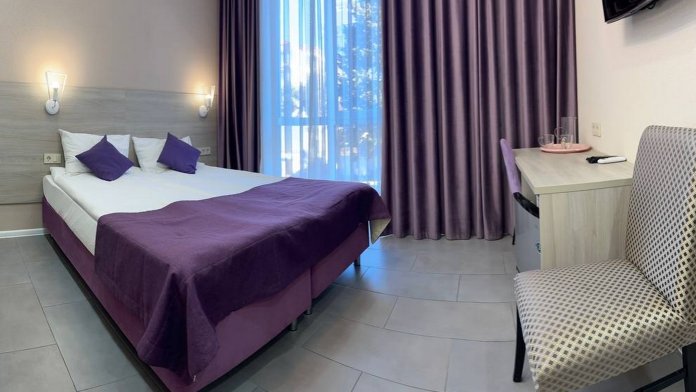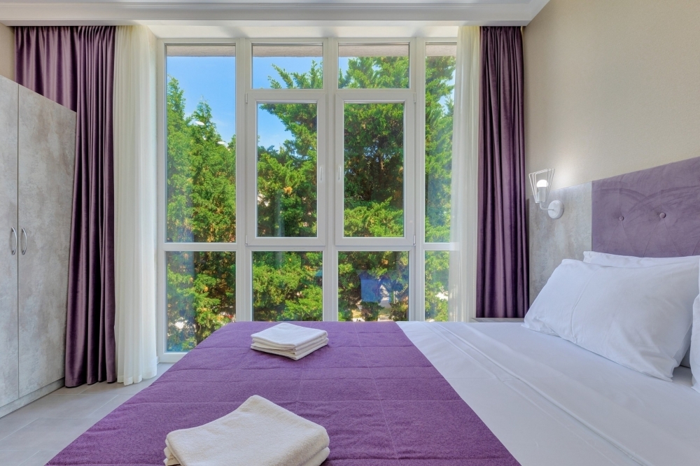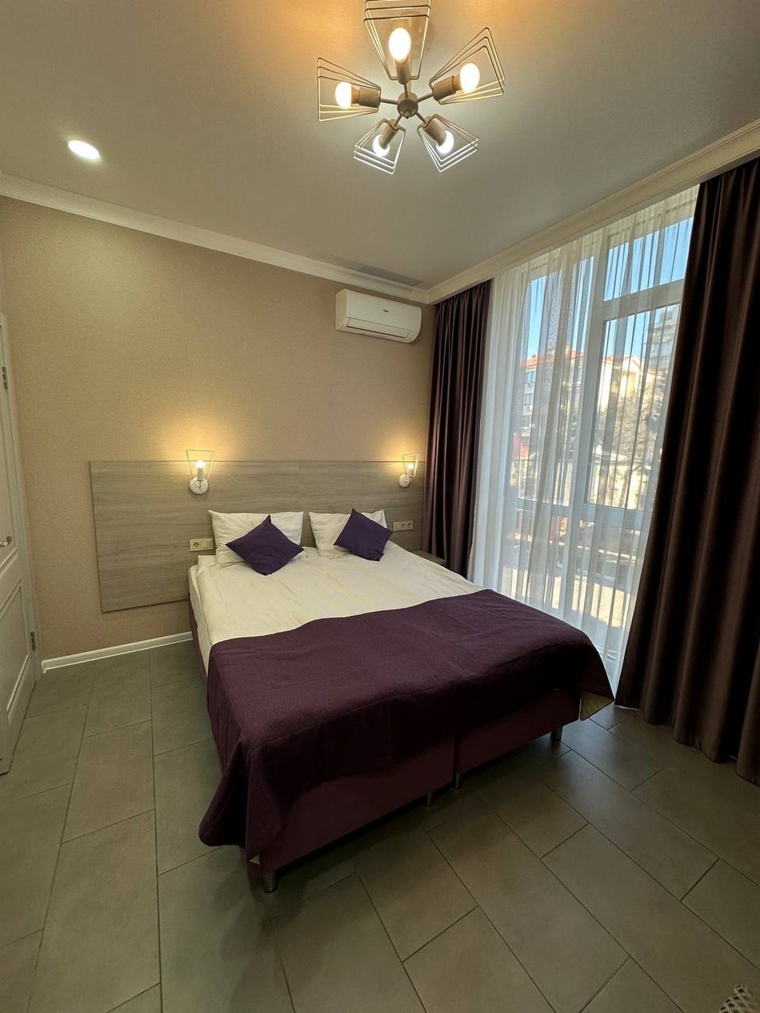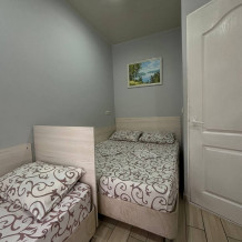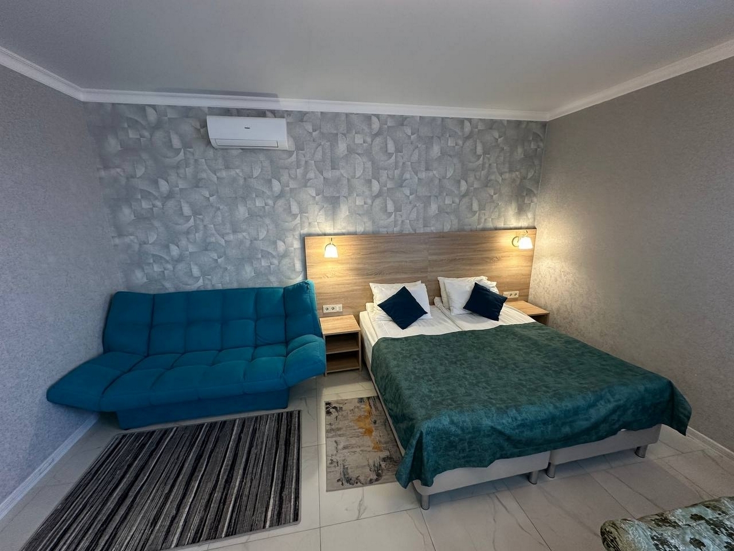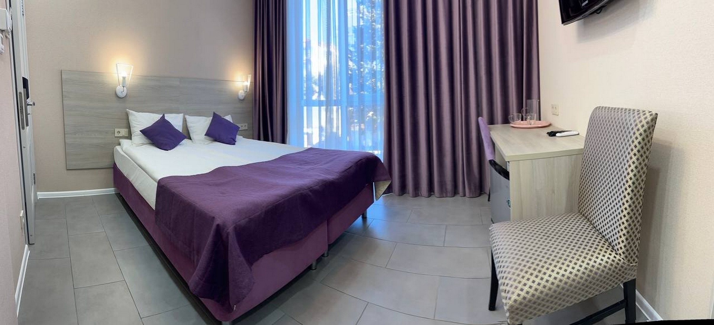 Имеет спальню с приятным интерьером. В номере: 1 двуспальная и 1 односпальная кровати. Имеется телевизор, кондиционер, шкаф, вешалка, зеркало, журнальный столик, фен, стулья. Индивидуальная ванная комната: душ, раковина, туалет.