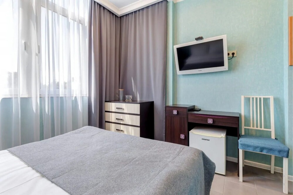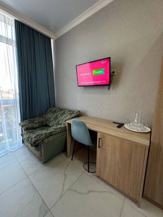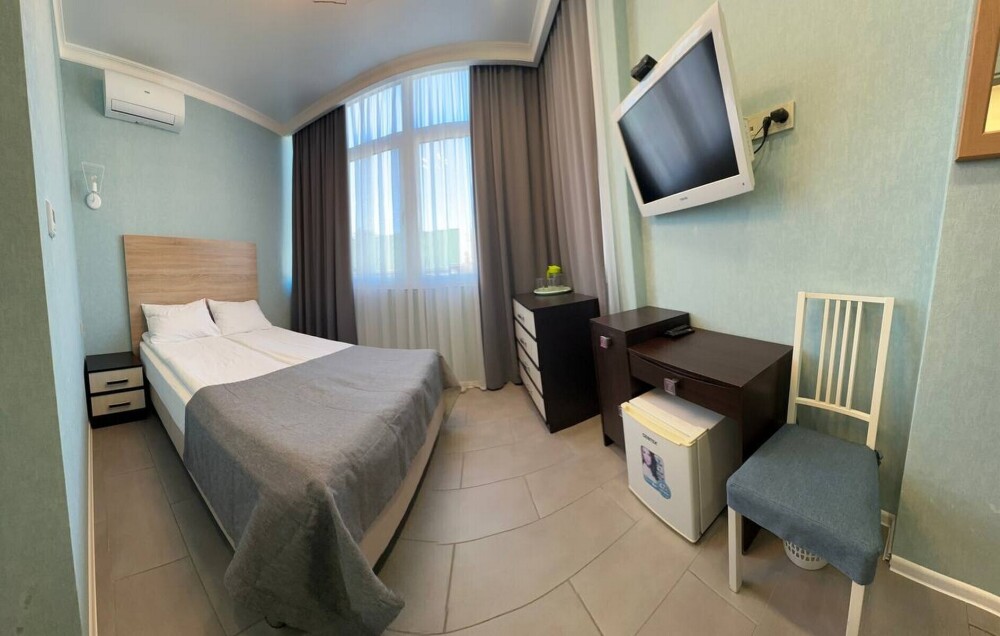 В номере: телевизор, кондиционер, шкаф, вешалка, зеркало, стол обеденный, рабочий стол, холодильник, фен, стулья. Индивидуальная ванная комната: душ, раковина, туалет.