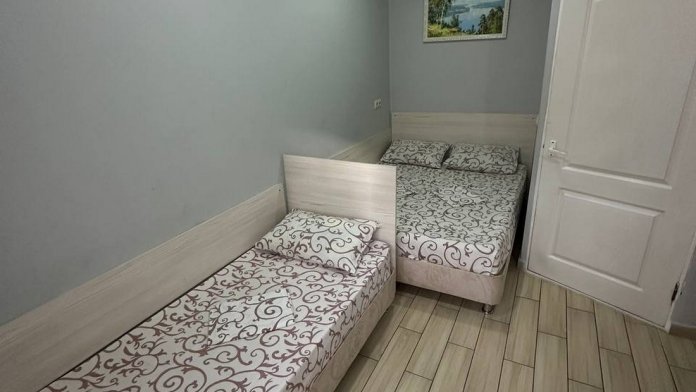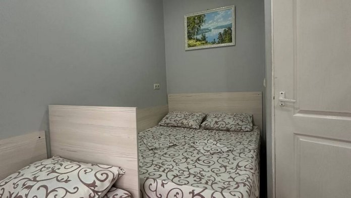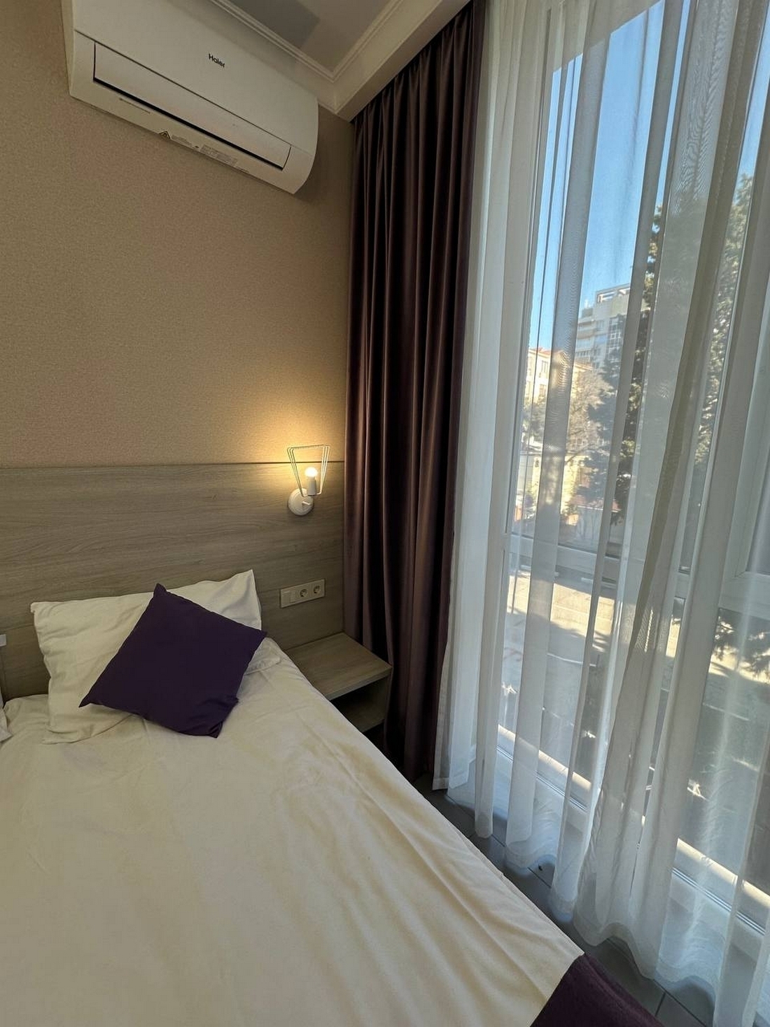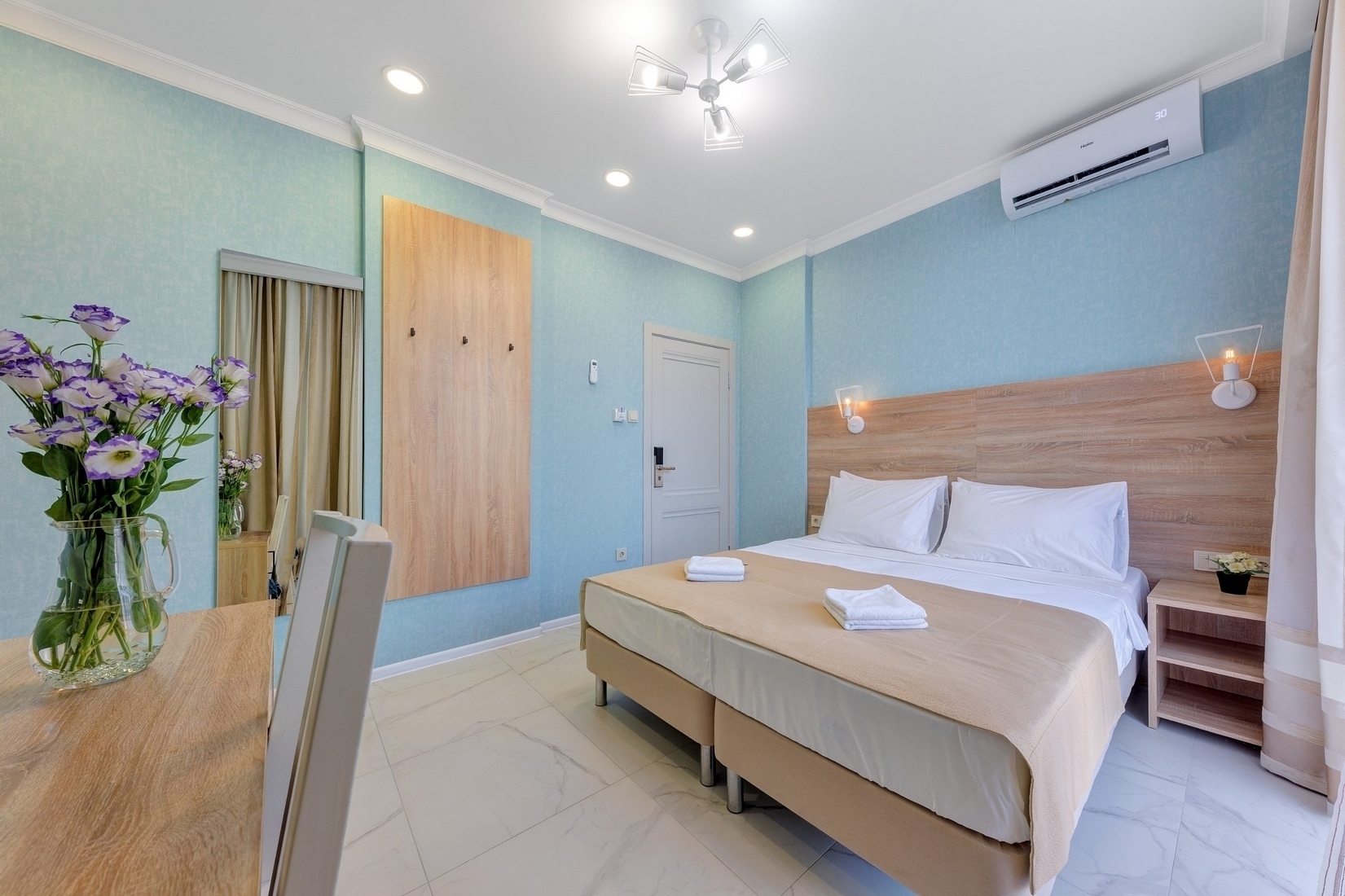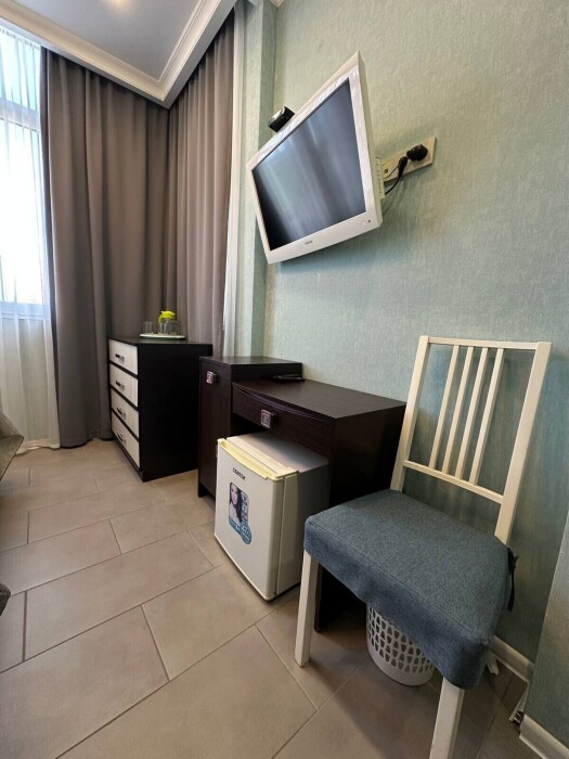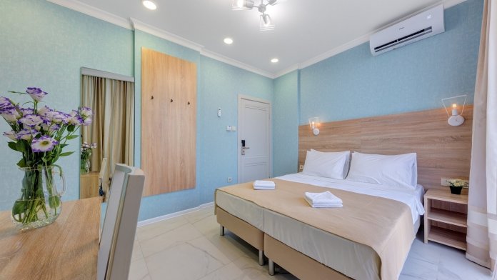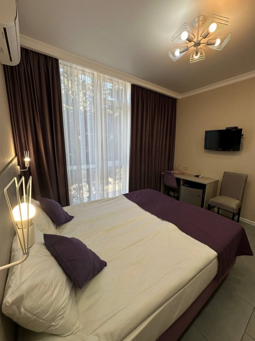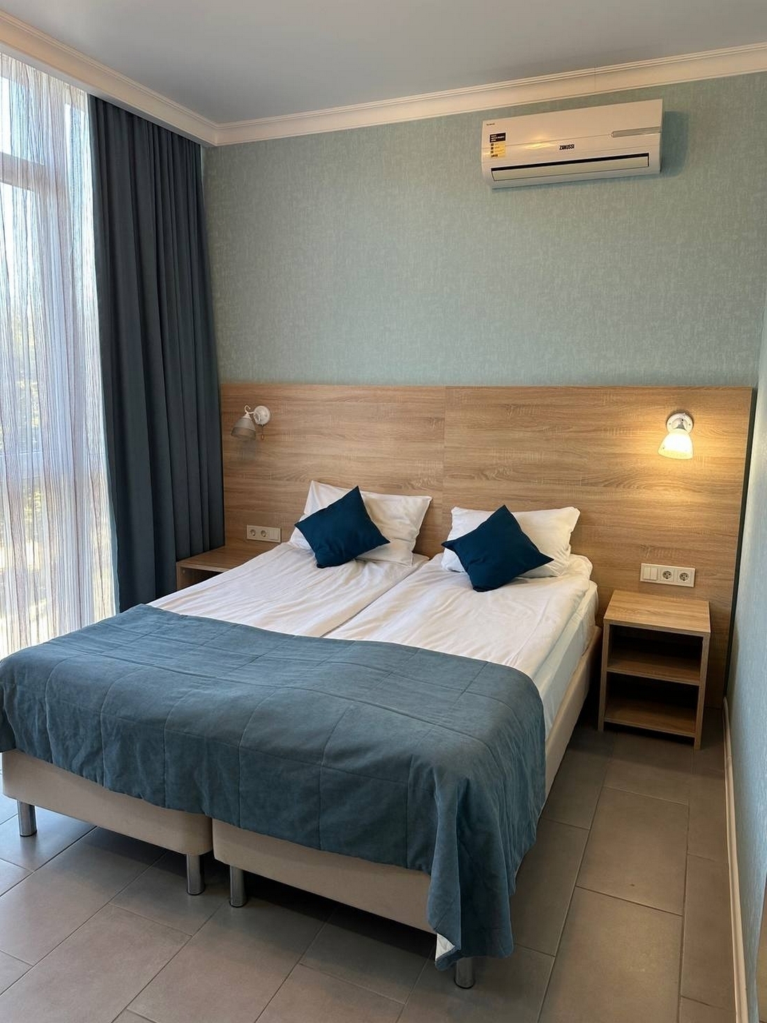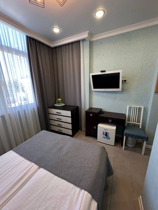 В номере: 1 двуспальная и 1 односпальная кровати. Имеется телевизор, кондиционер, шкаф, вешалка, зеркало, журнальный столик, фен, стулья. Индивидуальная ванная комната: душ, раковина, туалет.