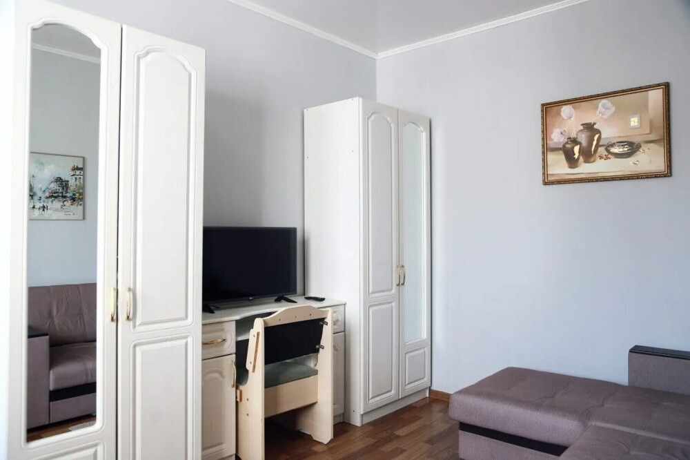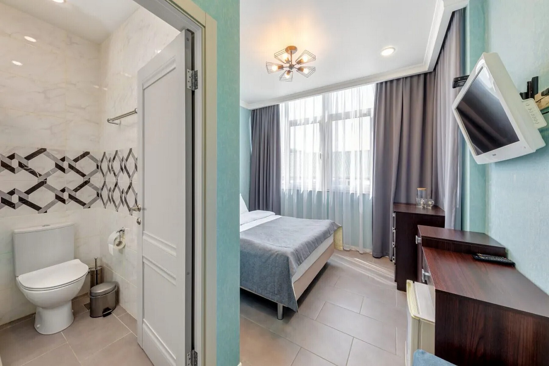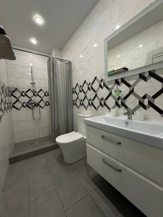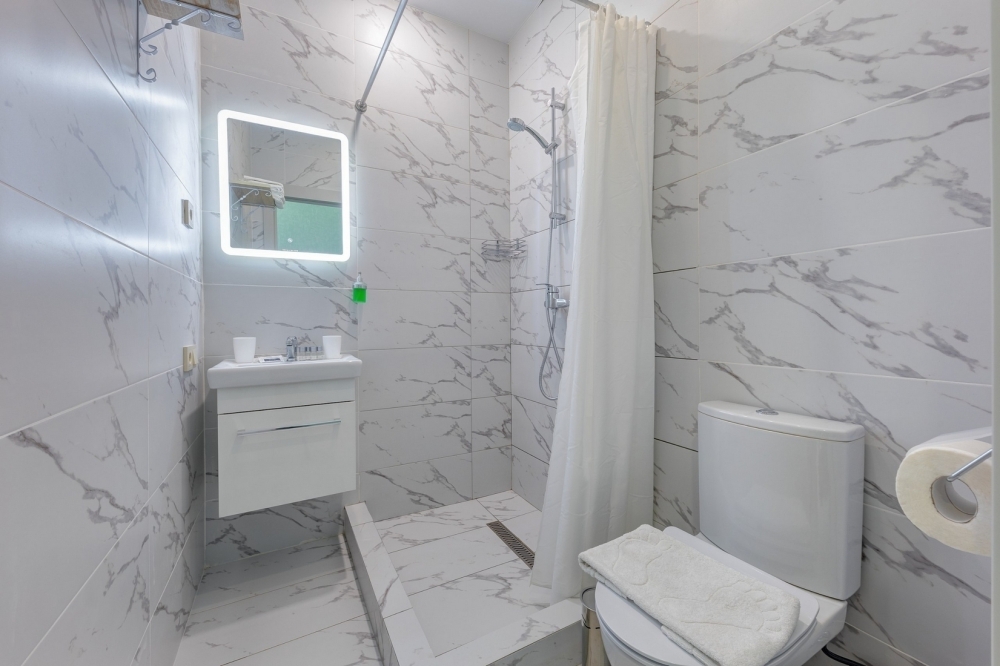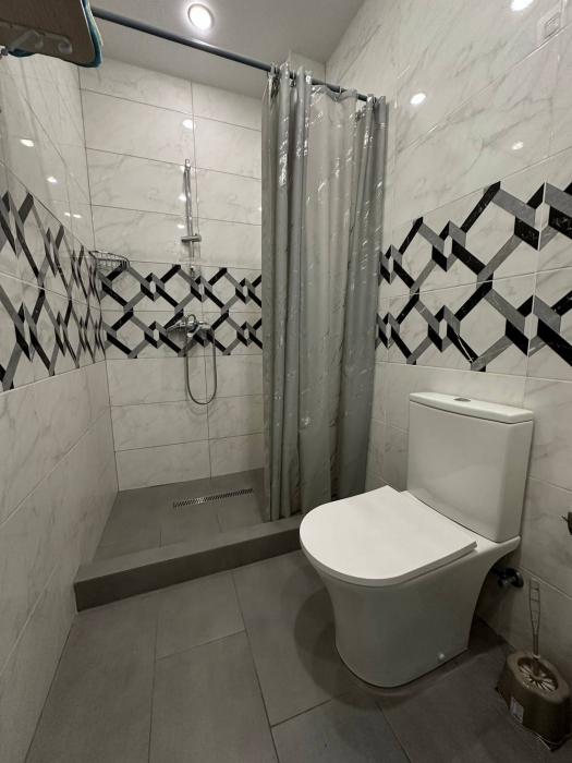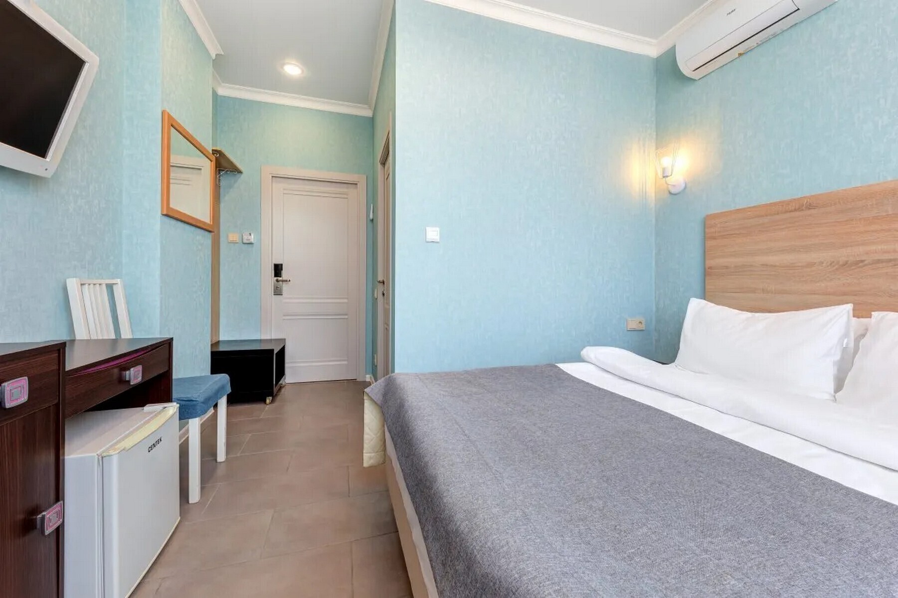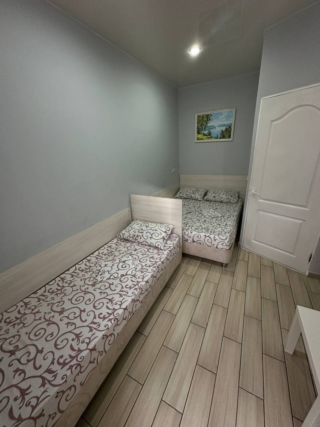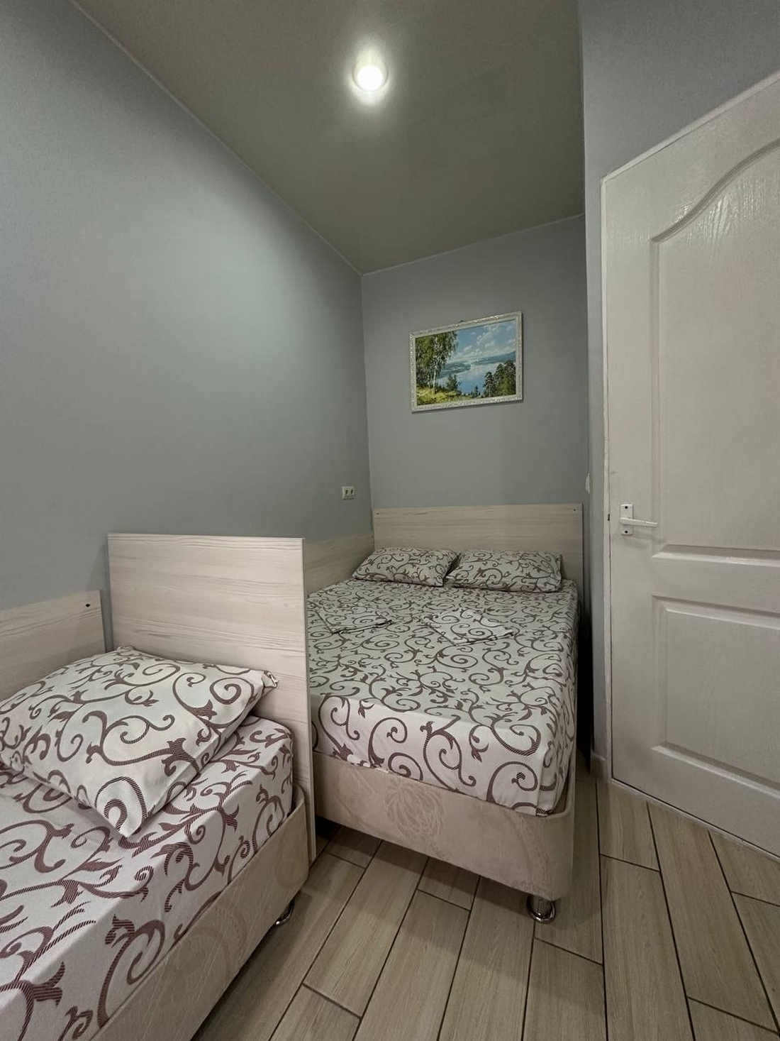 В номере: 1 двуспальная и 1 односпальная кровати. Имеется телевизор, кондиционер, шкаф, вешалка, зеркало, журнальный столик, фен, стулья. Индивидуальная ванная комната: душ, раковина, туалет.
