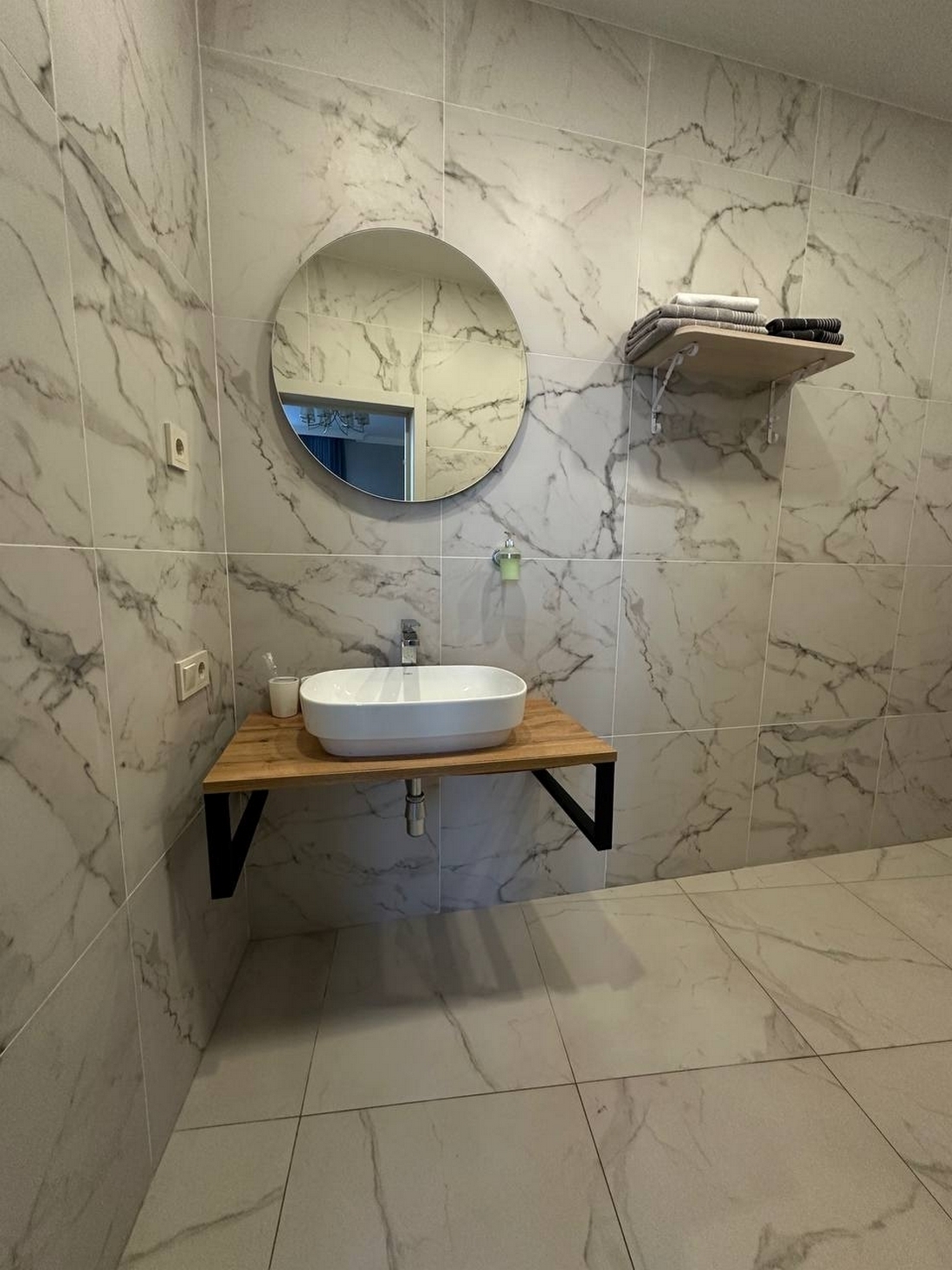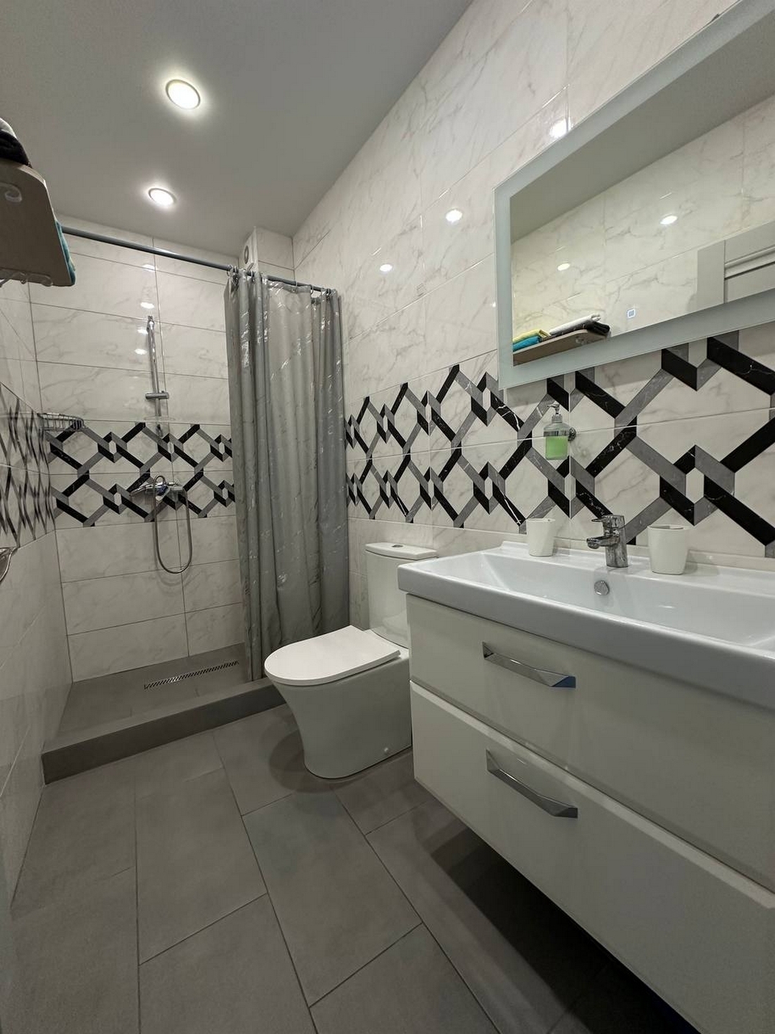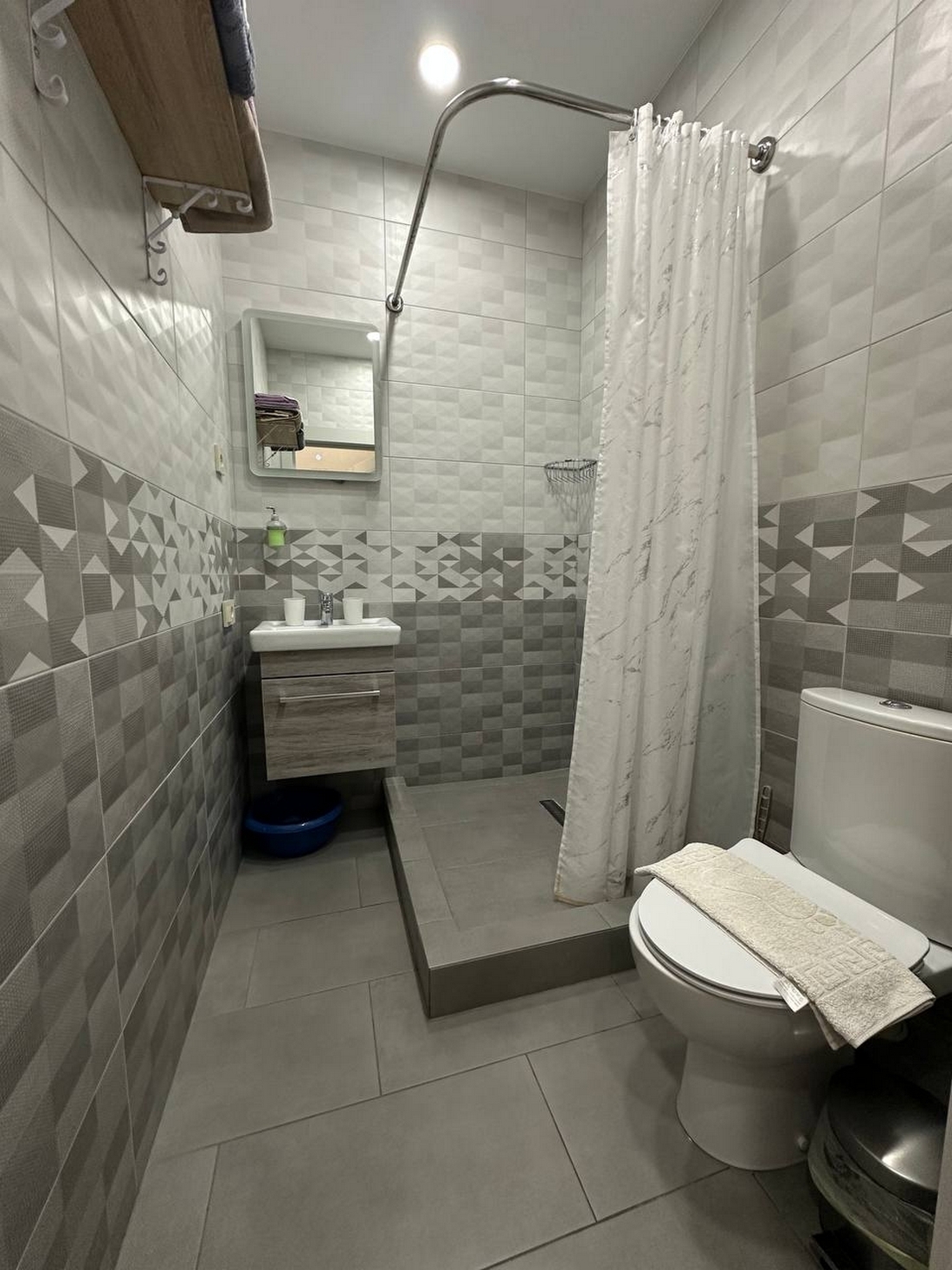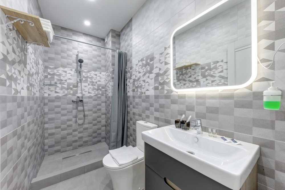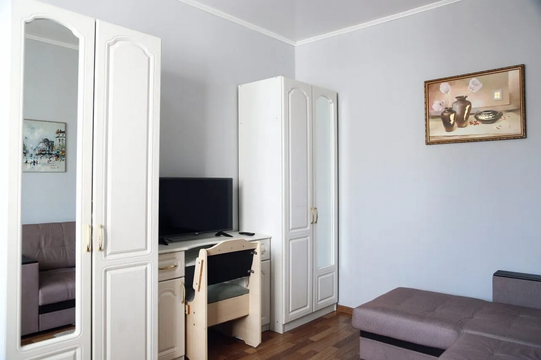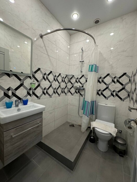 В номере: 1 двуспальная и 1 односпальная кровати. Имеется телевизор, кондиционер, шкаф, вешалка, зеркало, журнальный столик, фен, стулья. Индивидуальная ванная комната: душ, раковина, туалет.