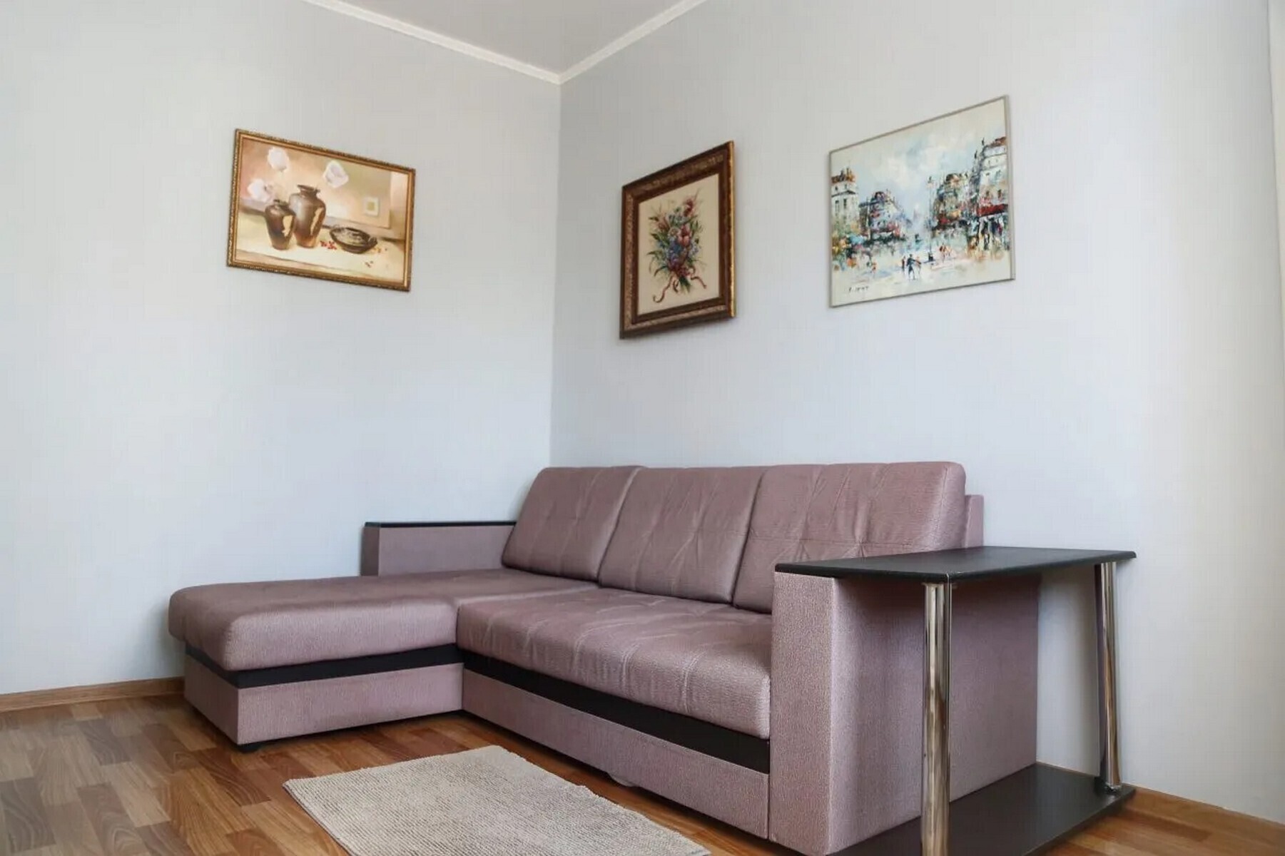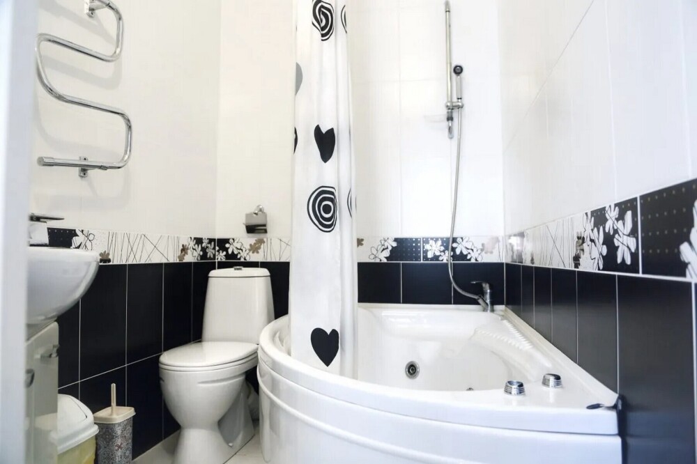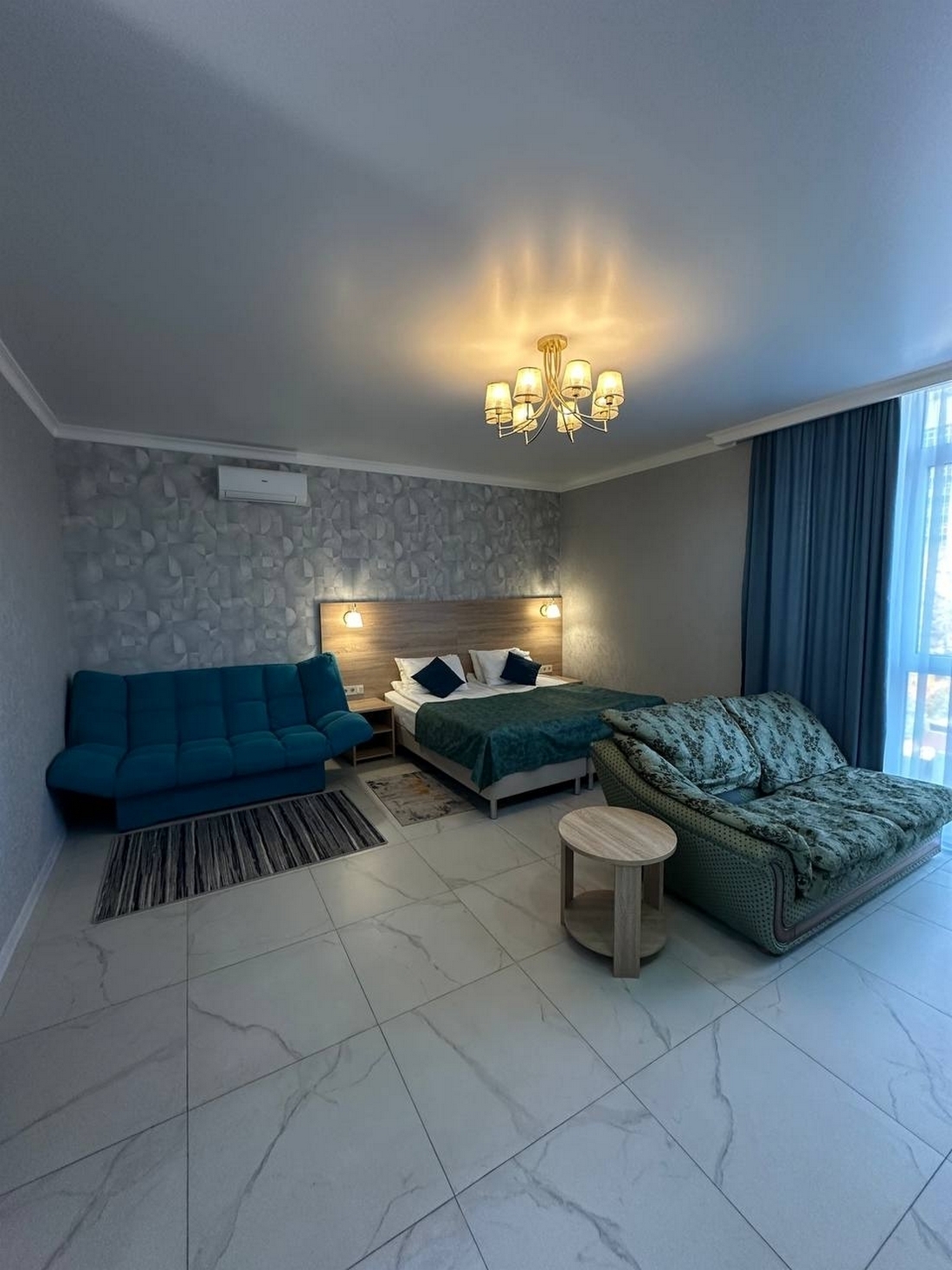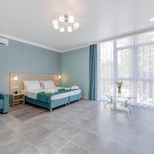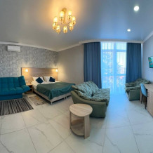 Подходит для размещения 4 человек. Имеет гостиную и спальню с приятным интерьером. В номере: 1 двуспальная кровать, 1 двуспальный диван. Имеется телевизор, кондиционер, шкаф, вешалка, зеркало, журнальный столик, фен, холодильник, плита, СВЧ, чайник, стулья. Индивидуальная ванная комната: душ, раковина, туалет.