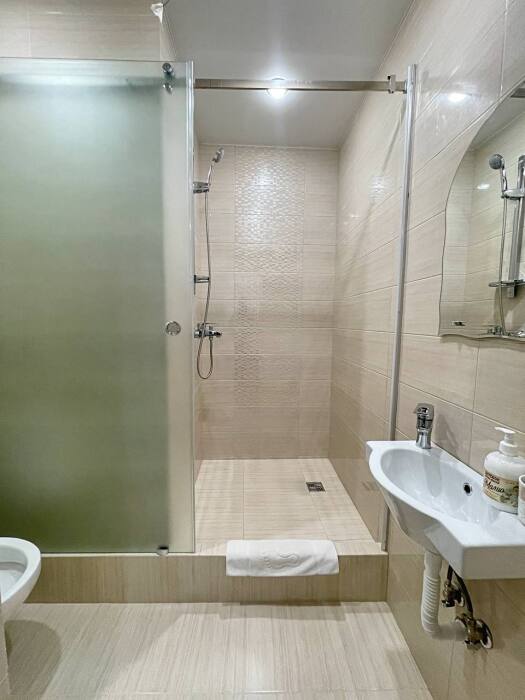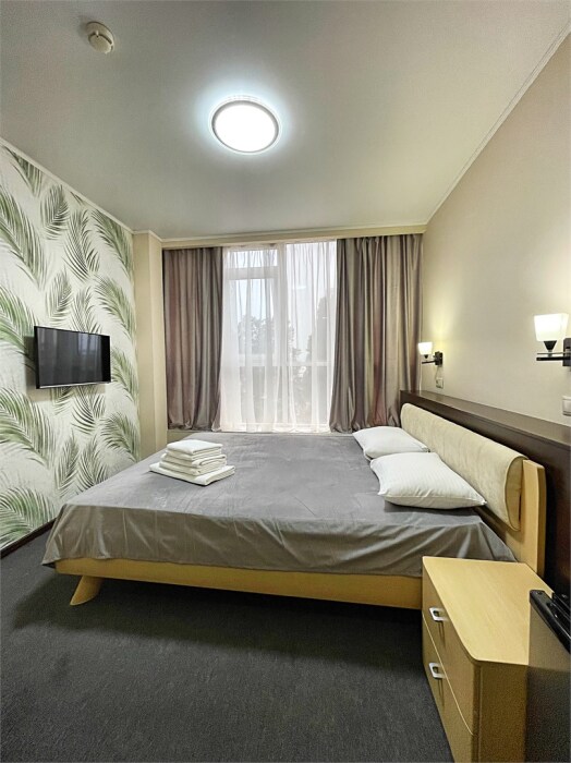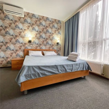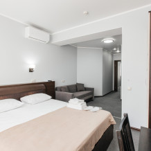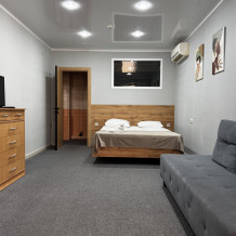 Номер для небольшой семьи или компании из 3 человек. В номере двуспальная кровать и одноместный диванчик раскладной. Номер оснащен всем необходимым для проживания, душ, туалет, 2 телевизора (в зоне кухонной и спальной) кондиционер, фен, тапочки, белоснежные полотенца, гигиенические принадлежности. В номере имеется своя полноценная кухня со всем необходимым.