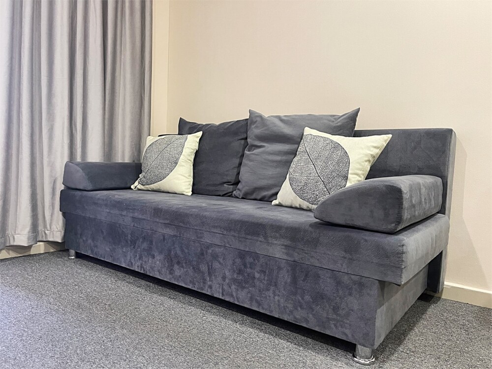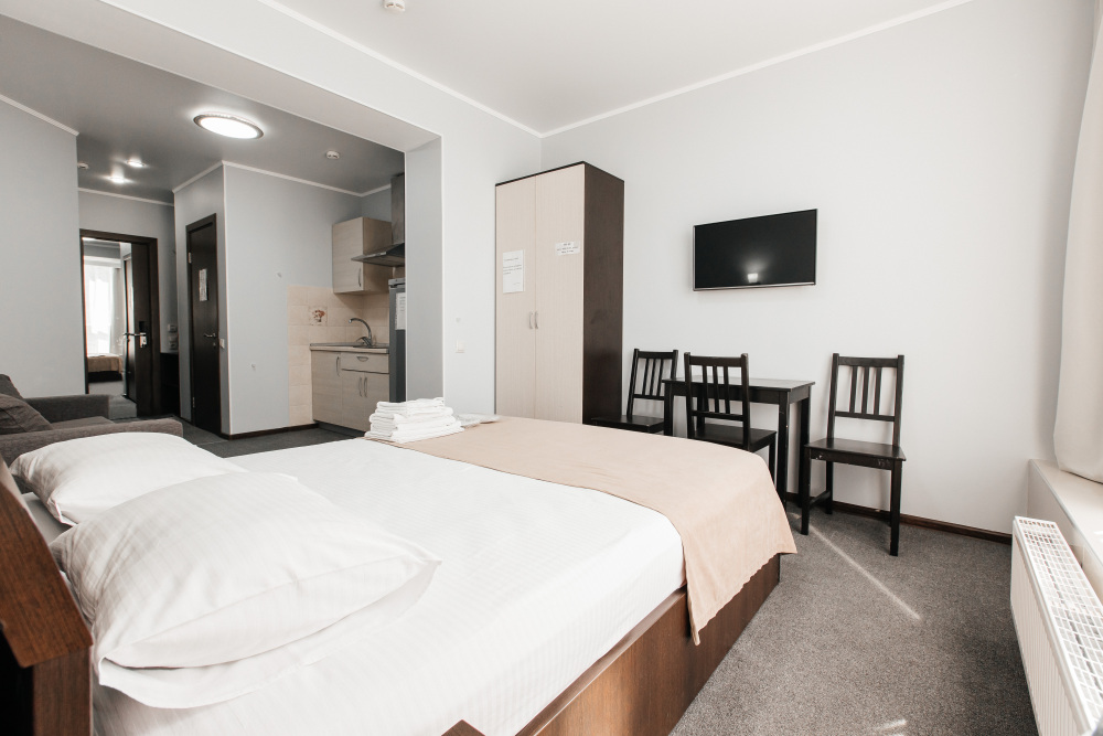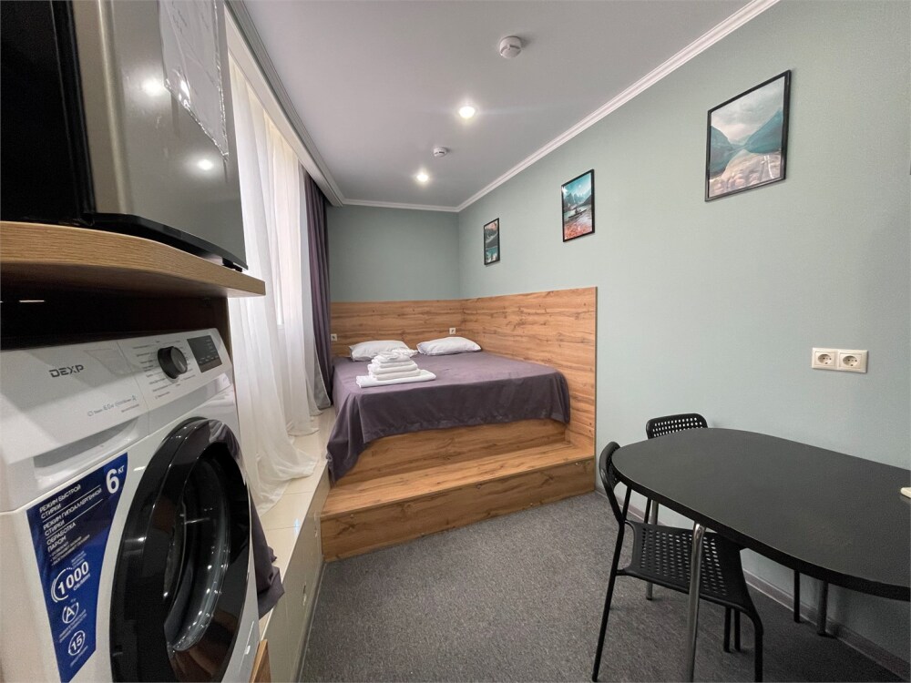 Двухместная студия с кухней со всеми удобствами: душ, туалет, холодильник, стиральная машинка, кондиционер, фен, белоснежные полотенца, тапочки, гигиенические принадлежности.