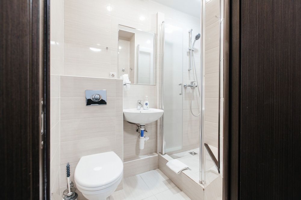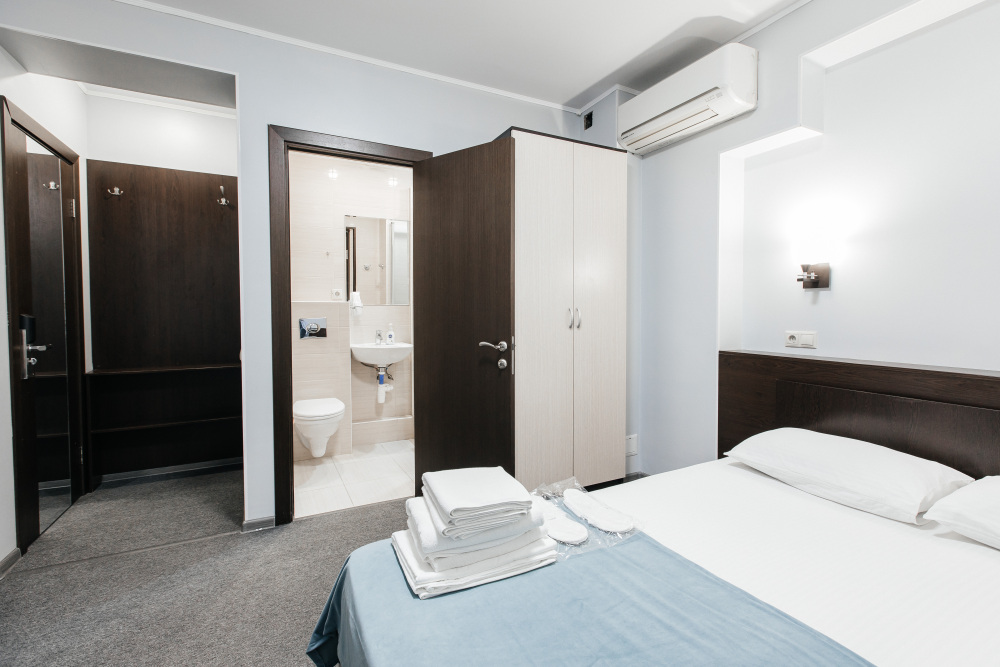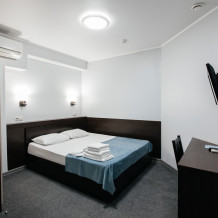 Компактный номер (без окна), номер оснащен всеми удобствами: душ, туалет, кондиционер, фен, холодильник, белоснежные полотенца, тапочки.