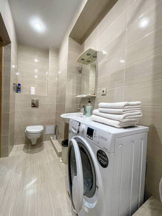 В апартаментах имеется своя кухня со всем необходимым для приготовления. В апартаментах есть душ, туалет, кондиционер, холодильник, микроволновка, чайник, фен, стиральная машина, сушилка для белья. Для комфорта имеется два телевизора в зоне гостевой и в зоне спальни.