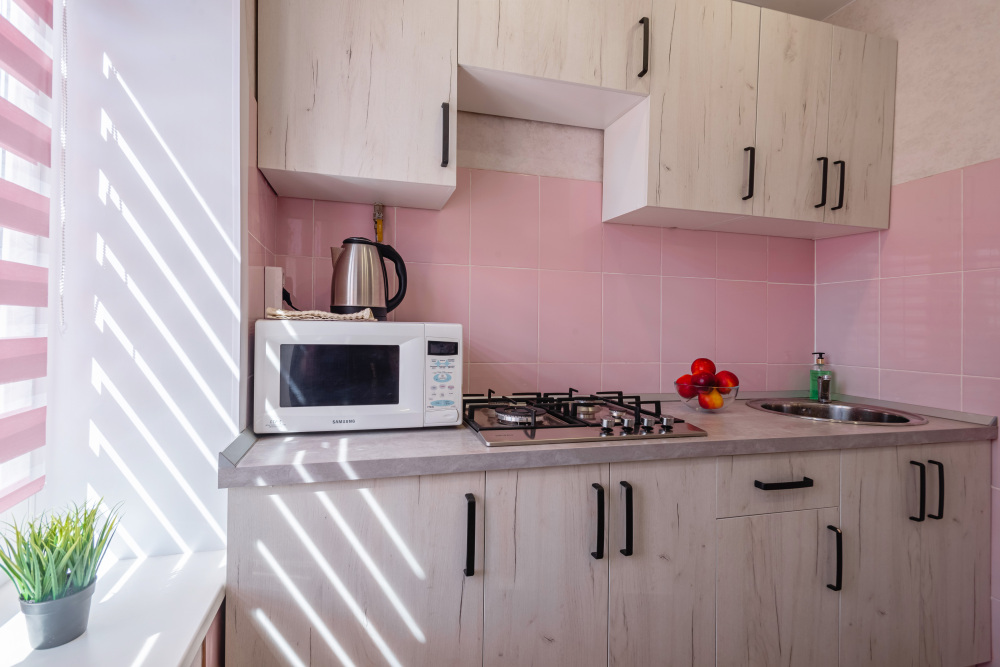 - на кухне есть всё необходимое: микроволновка, чайник, газовая плита, холодильник, посуда, столовые приборы и т. д;