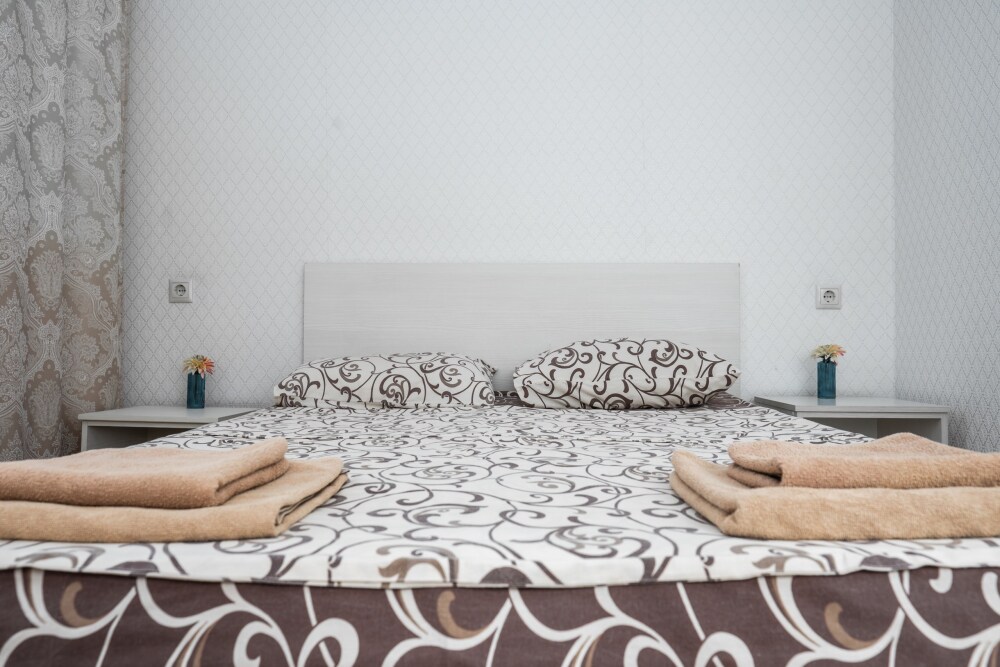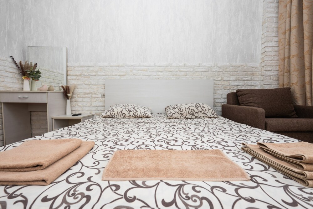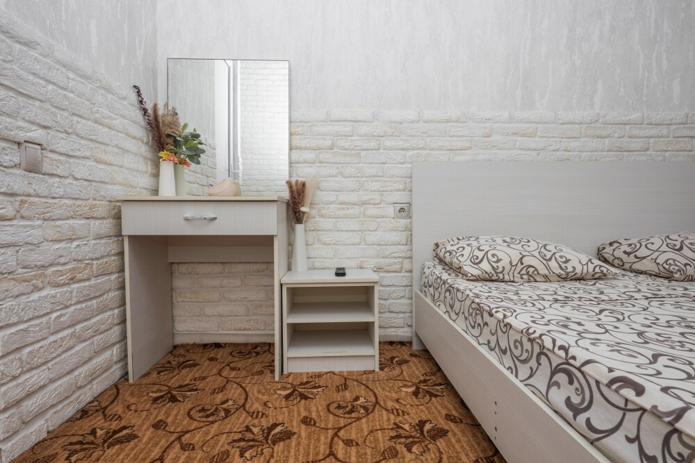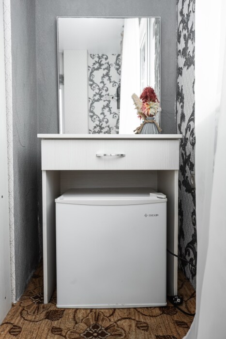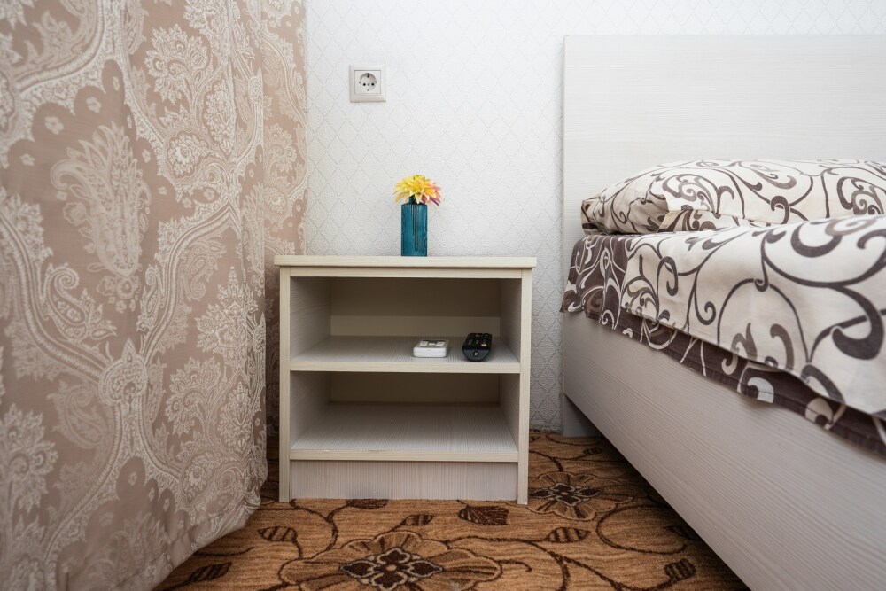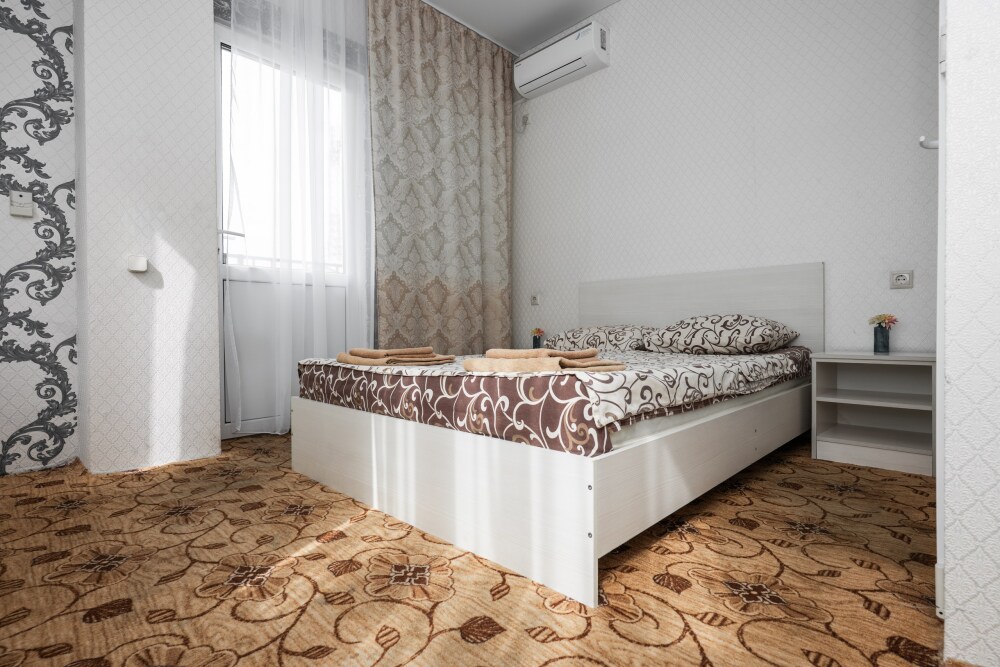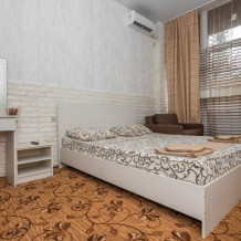 Двухместный полулюкс площадью 22 кв.м рассчитан на размещение до 2 гостей. В номере: двуспальная кровать, шкаф, комод и зеркало. Оснащение включает Wi-Fi, телевизор с кабельными каналами, кондиционер, небольшой холодильник и сушилку для одежды. Собственная ванная комната оборудована душем, предоставляются постельное бельё и полотенца.