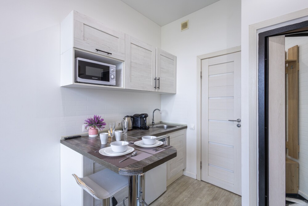 - Кухня с холодильником, плитой, микроволновкой, чайником и посудой.