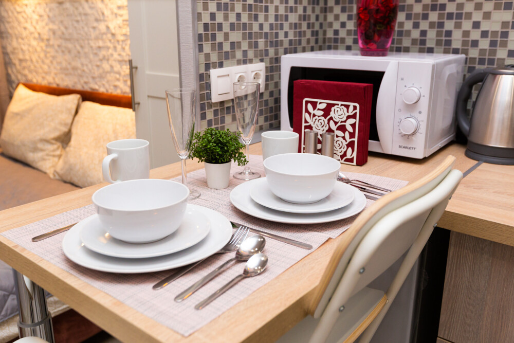 - Кухня с холодильником, плитой, микроволновкой, чайником и посудой