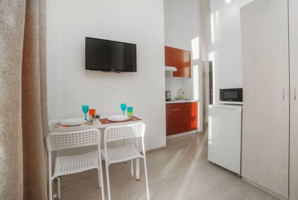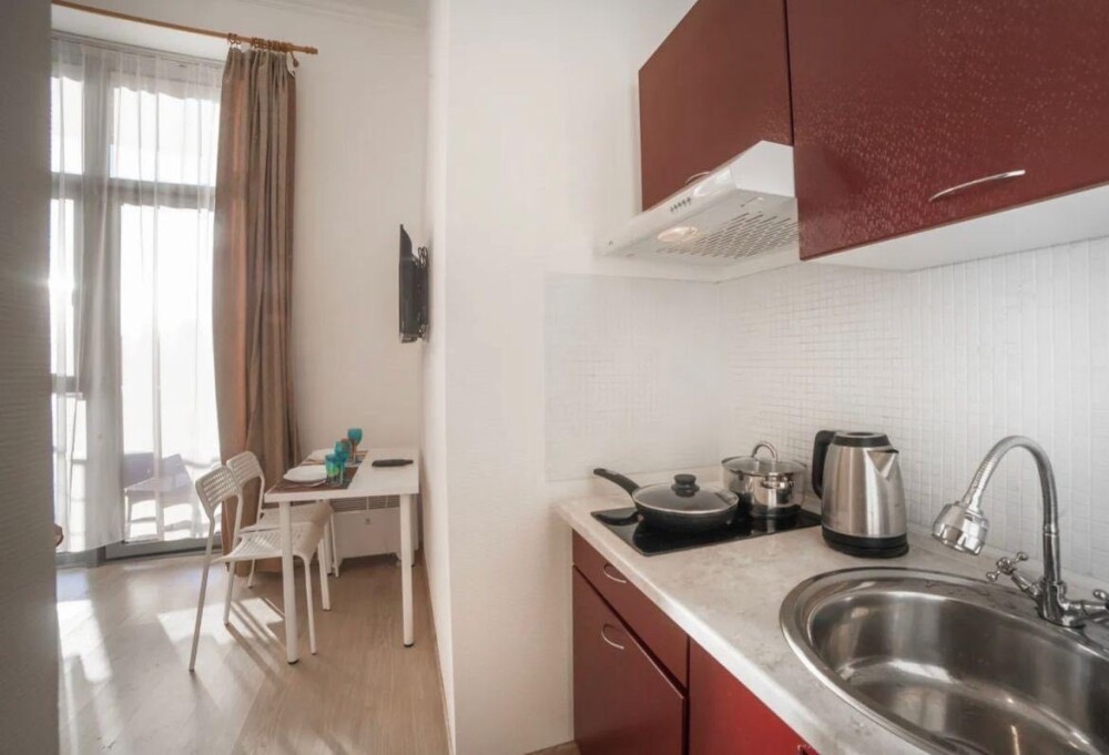 - Кухня с холодильником, плитой, микроволновкой, чайником и посудой