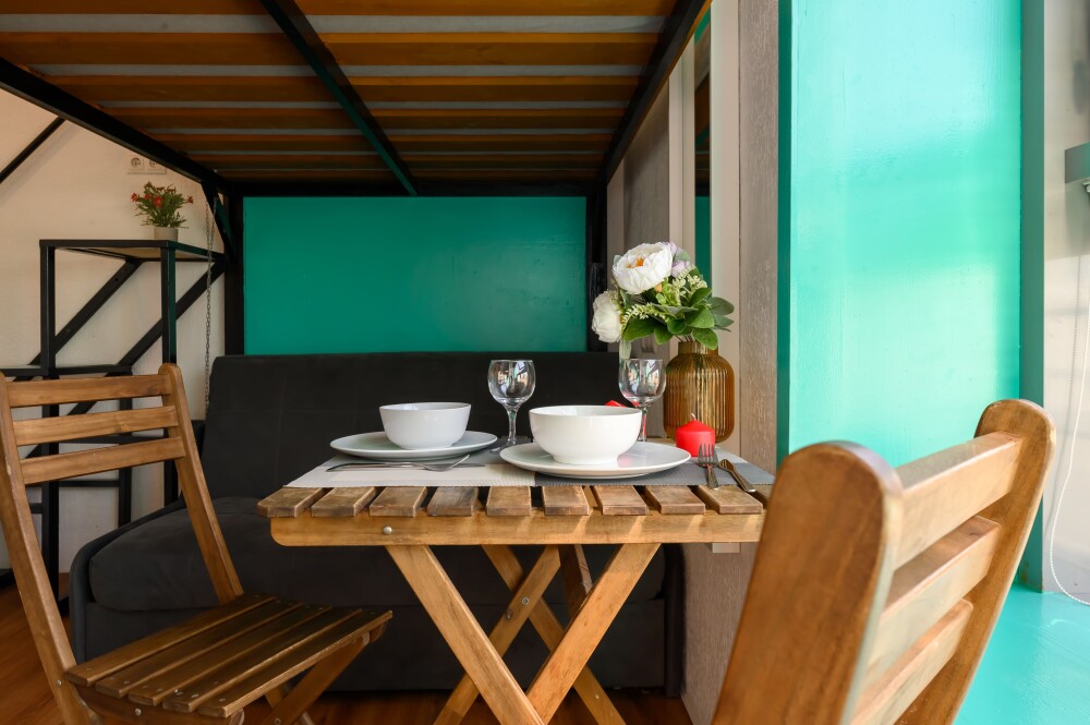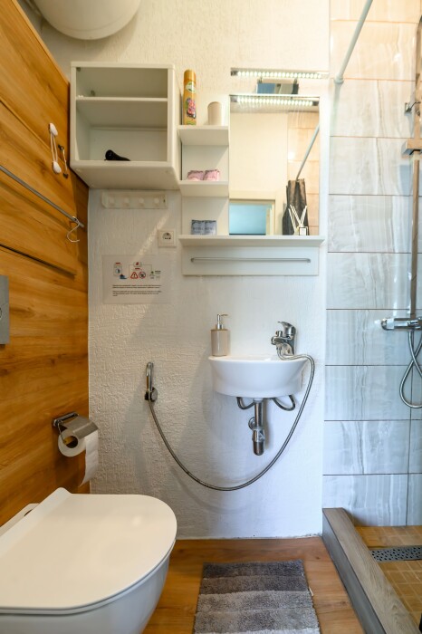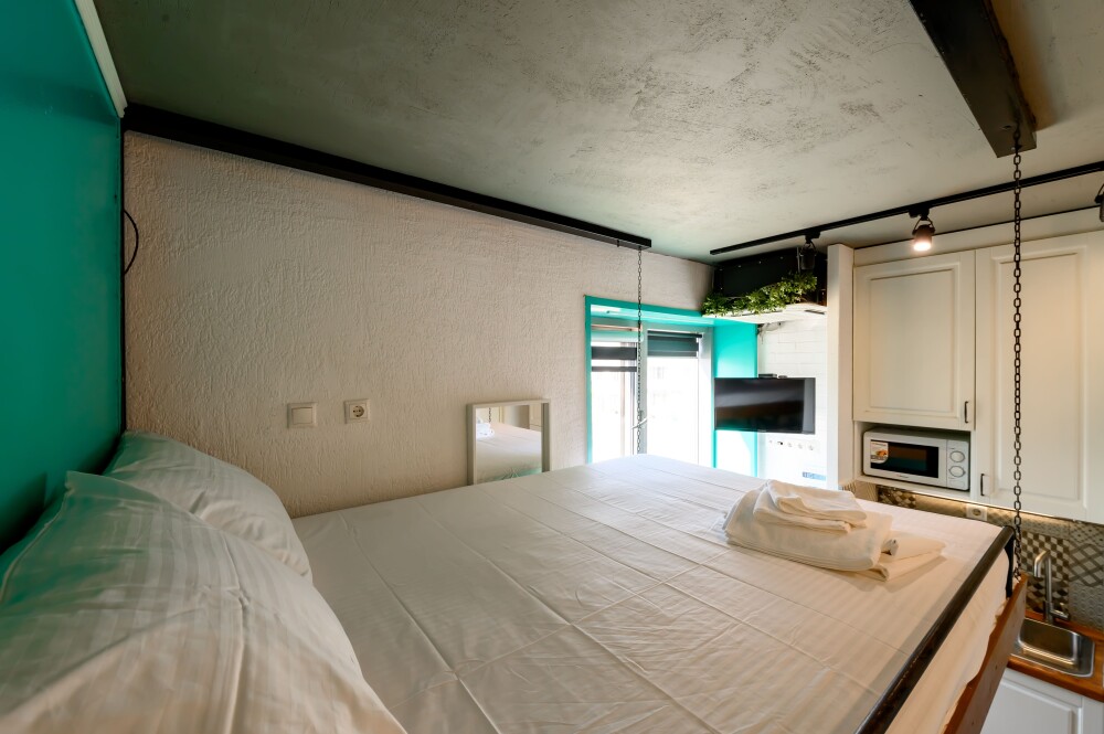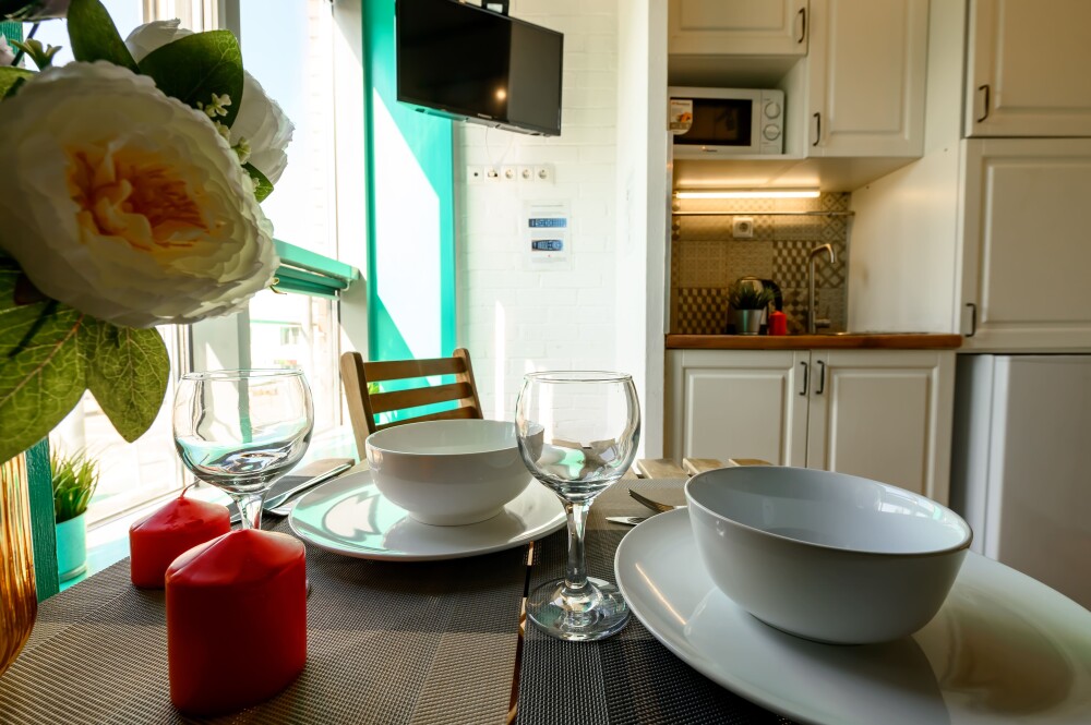 - Кухня с холодильником, плитой, микроволновкой, чайником и посудой
