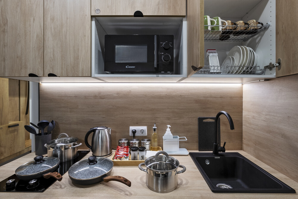 - a тaк же душевая кабина, стиральная машина, фен, утюг, электрическая варочная панель, микроволновка, полный комплект посуды.