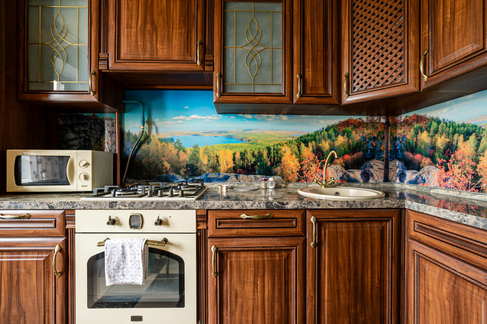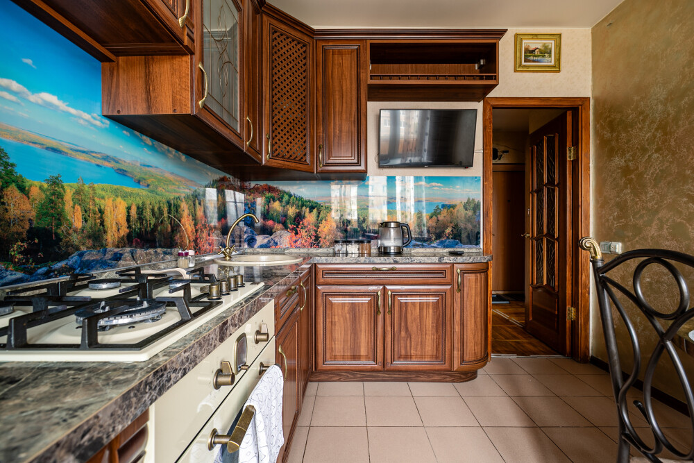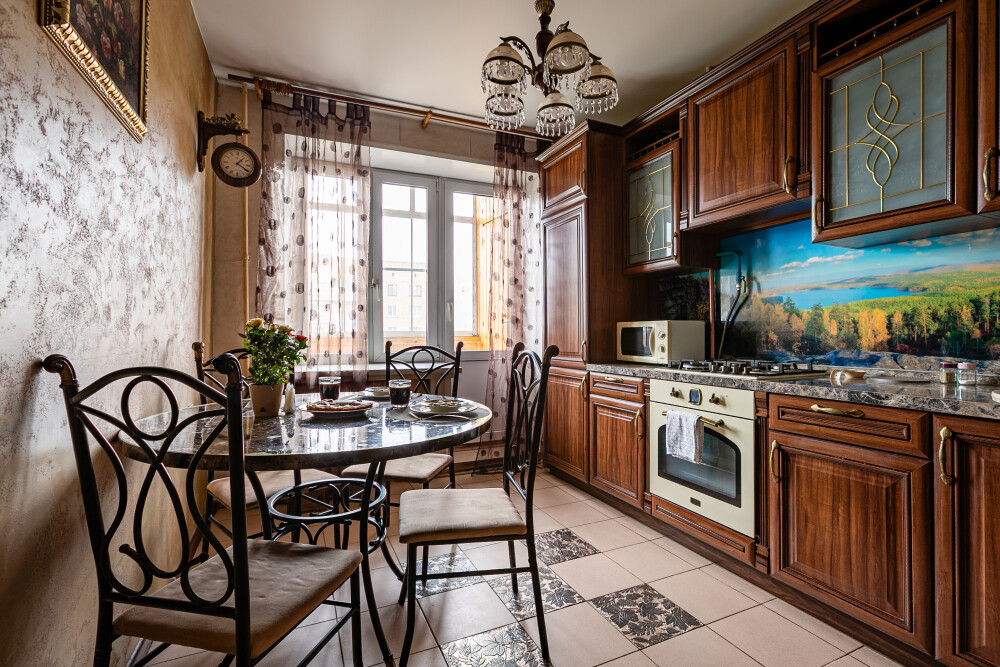 - оснащена бытовой техникой: плита, духовка, микроволновая печь, холодильник, электрический чайник;