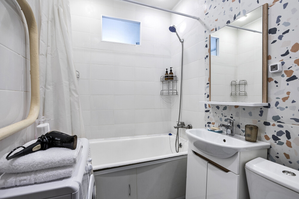 В квартире есть все необходимое, для размещения 2 человек и даже больше: Wi-F, ванна, стиральная машина, фен, утюг, электрический духовой шкаф, полный комплект посуды, двуспальная кровать, раскладной диван, телевизор и многое другое.