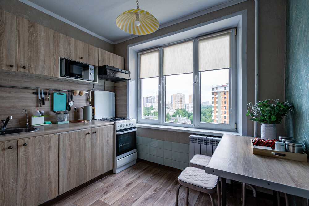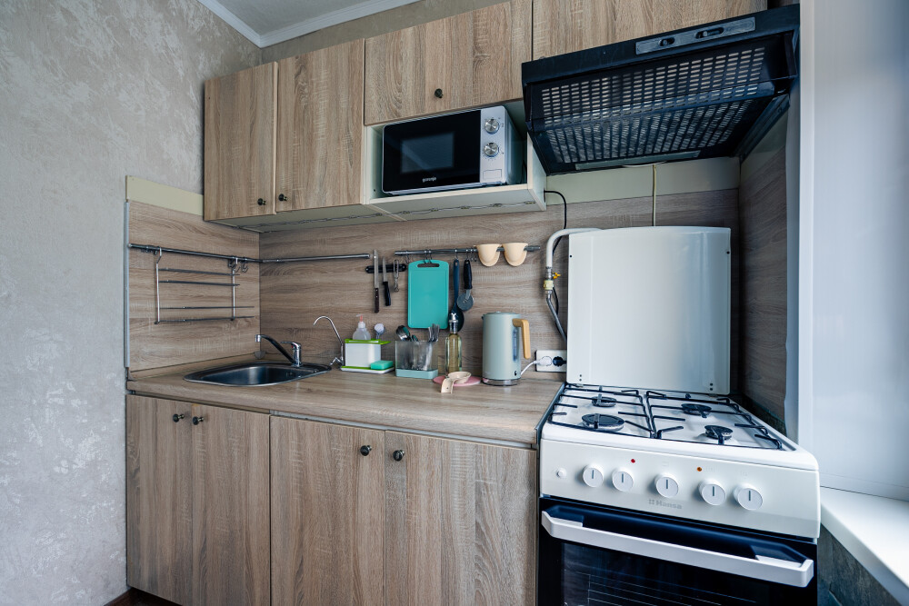 Оснащена бытовой техникой: плита, духовка, микроволновая печь, фильтр для воды, холодильник, электрический чайник