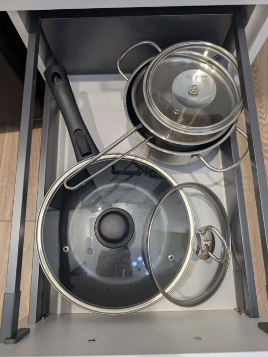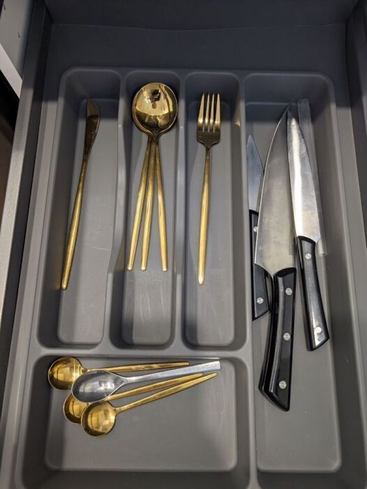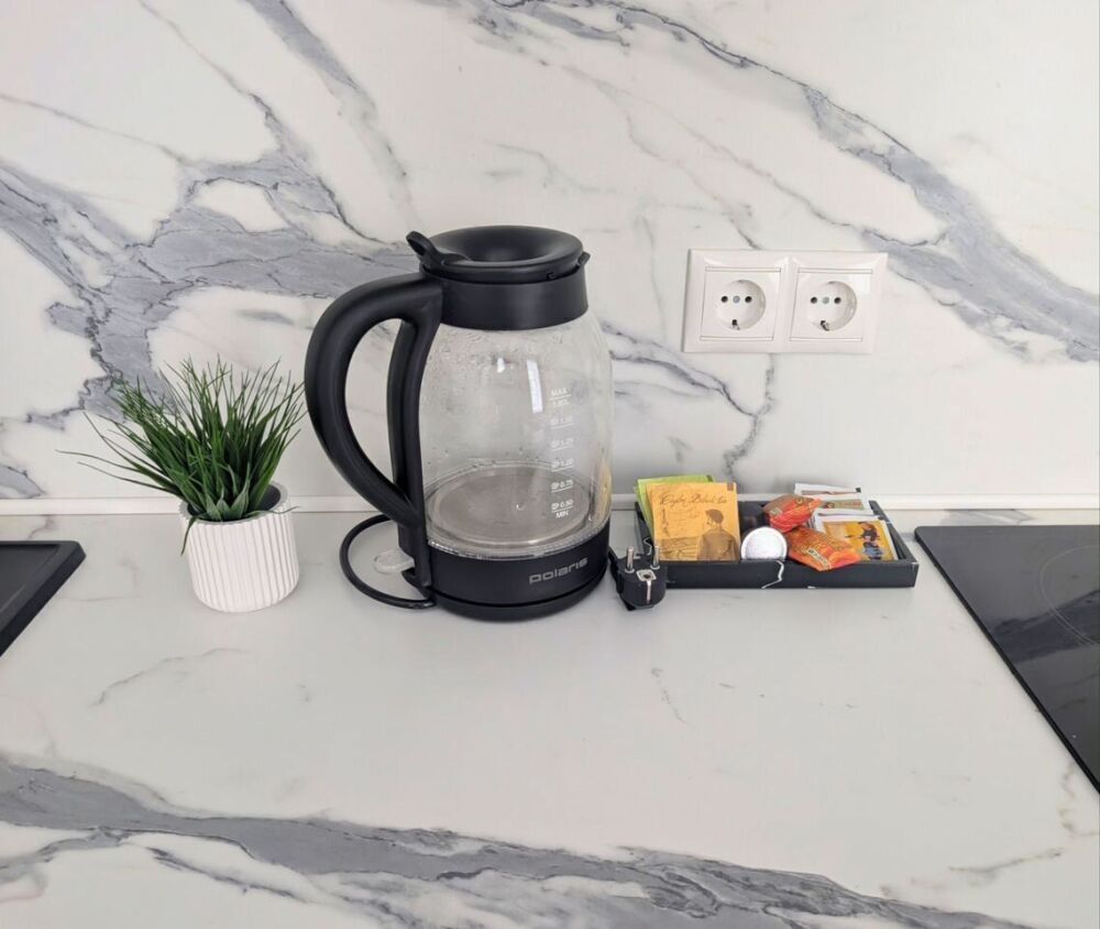 - мини-кухня со всем необходимым для приготовления пищи: холодильник, плита, СВЧ, чайник, кофемашина а так же набор посуды и кухонных приборов.