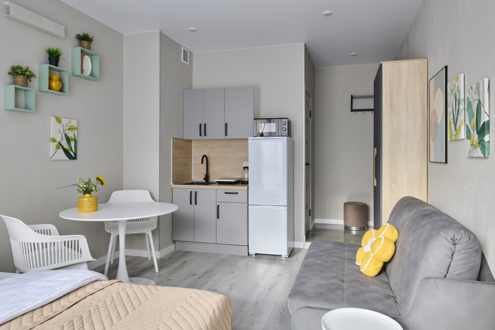 - Кухня с холодильником, плитой, микроволновкой, чайником и посудой