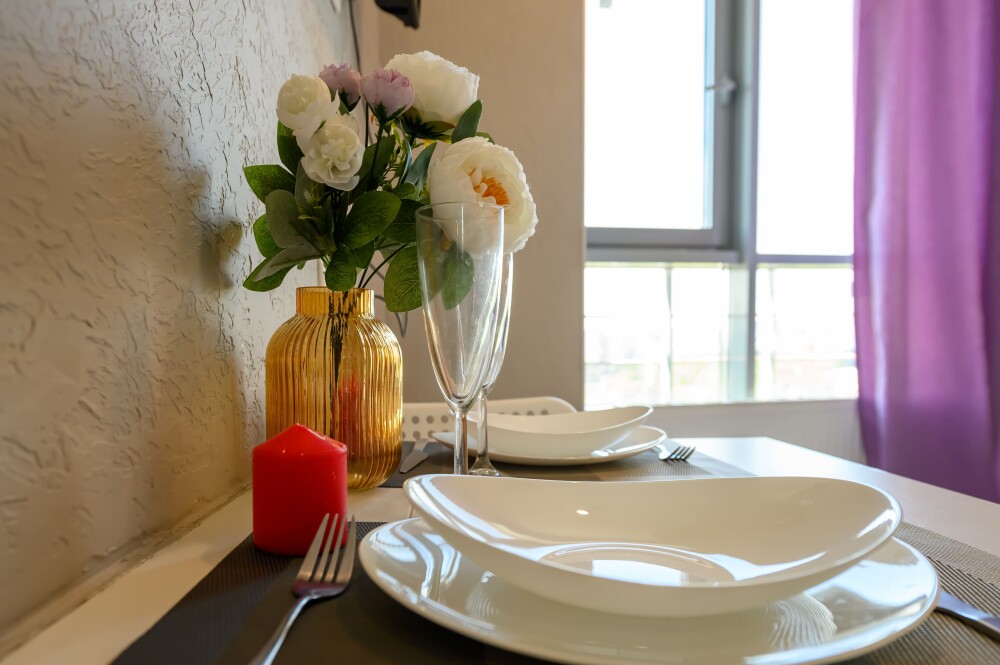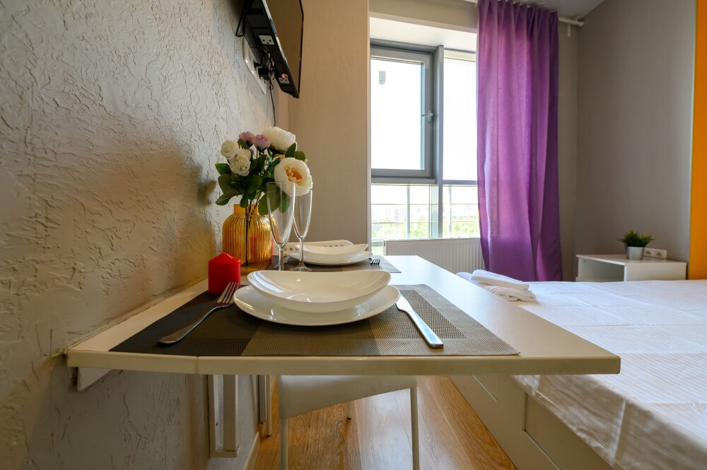 - Кухня с холодильником, плитой, микроволновкой, чайником и посудой