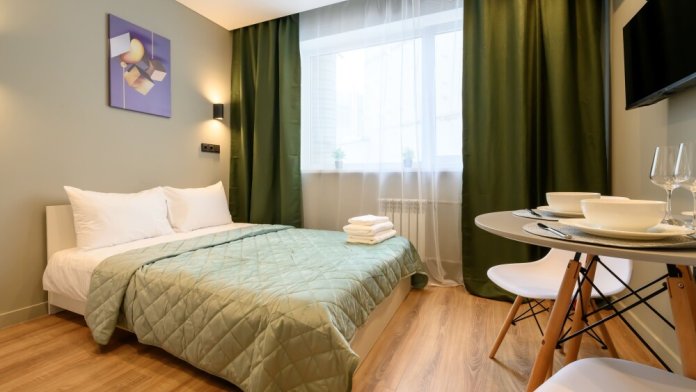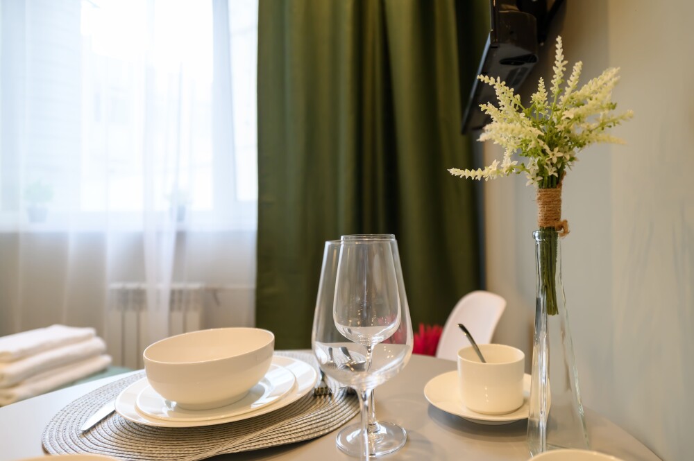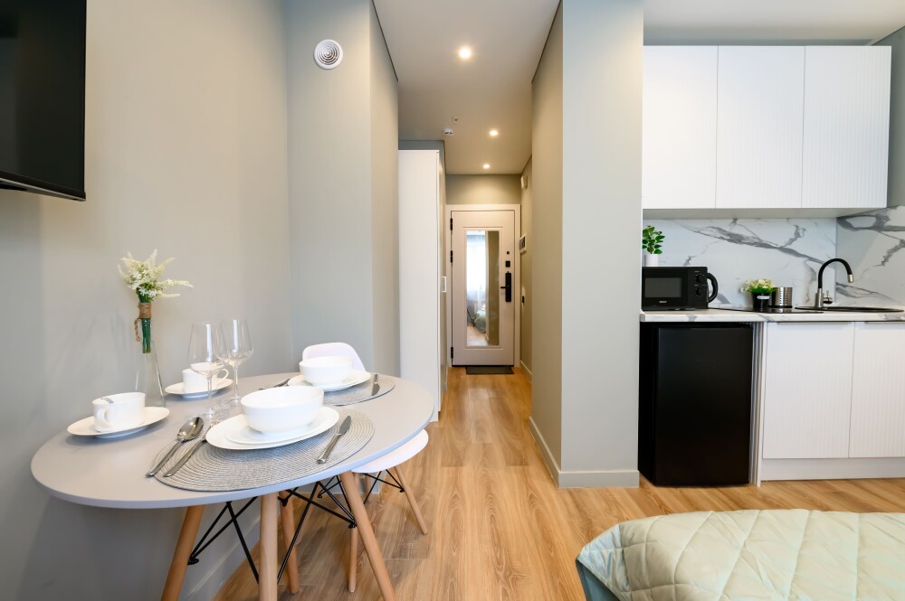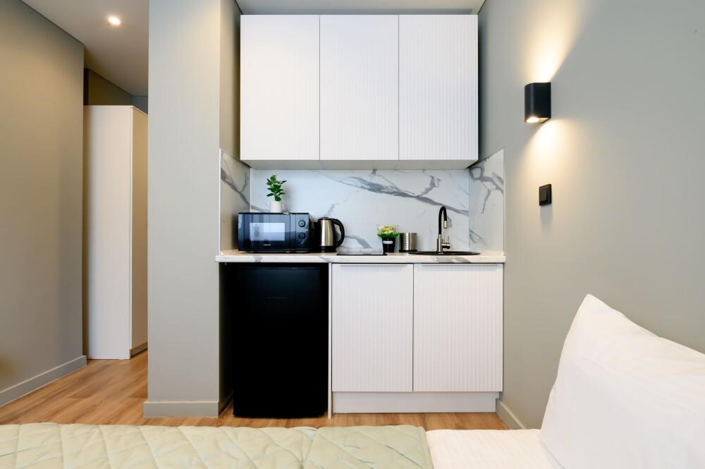 - Кухня с холодильником, плитой, микроволновкой, чайником и посудой