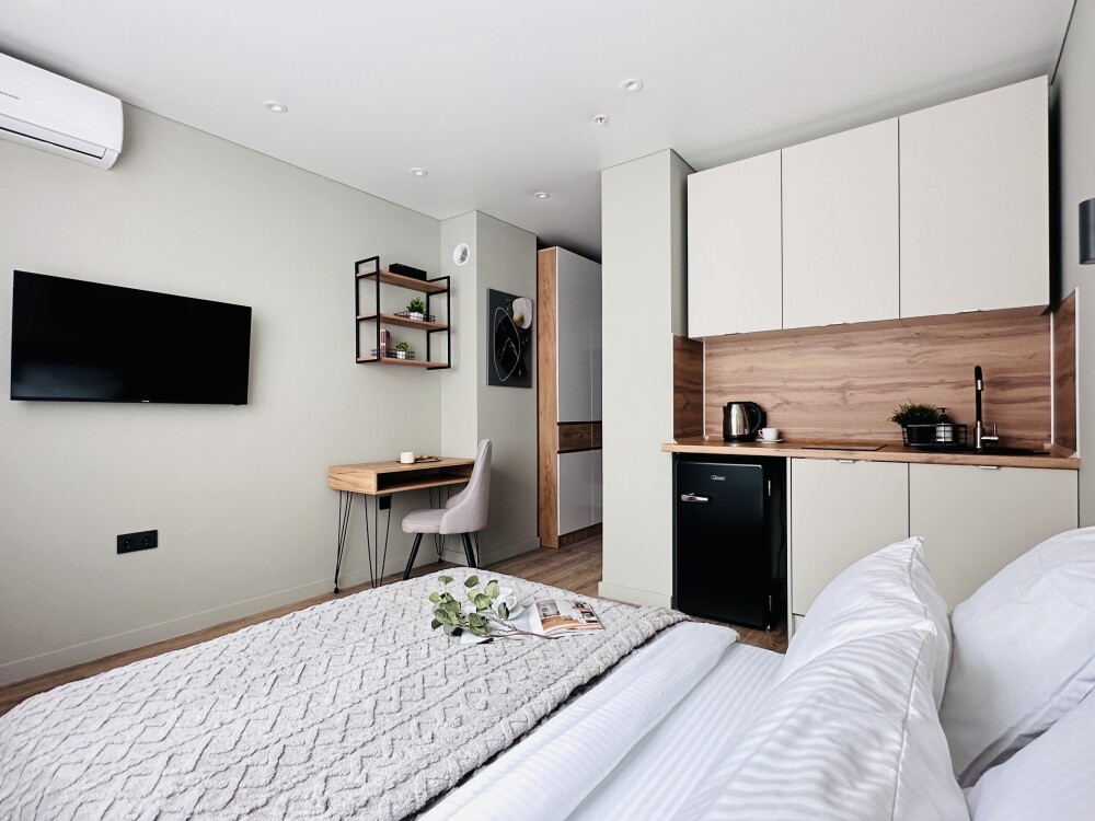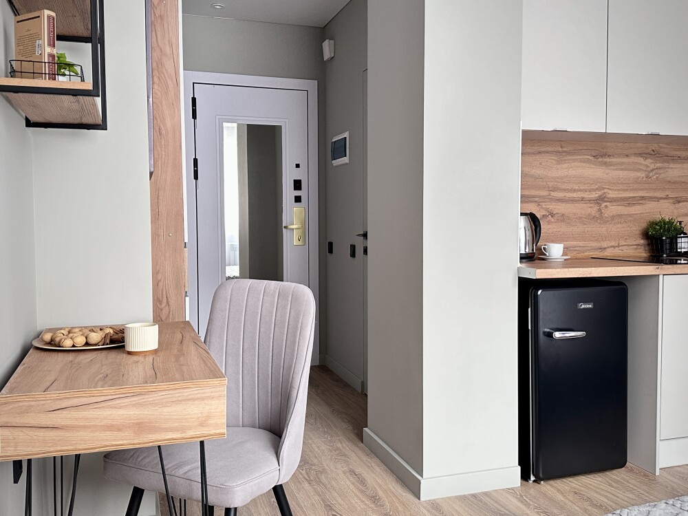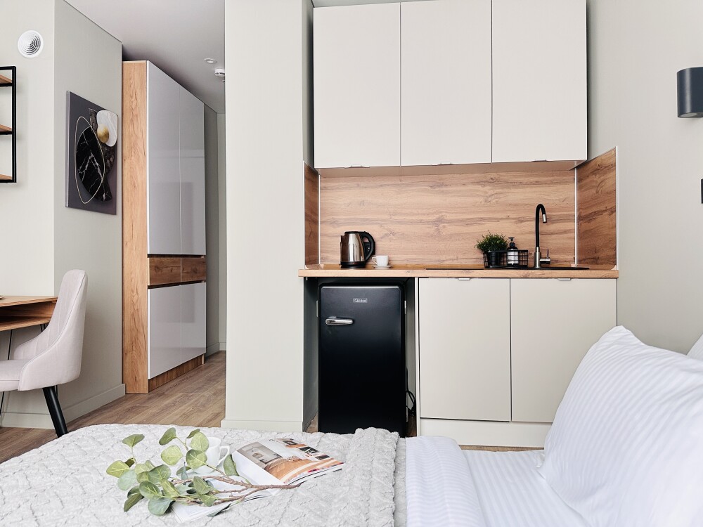 - Кухня с холодильником, плитой, микроволновкой, чайником и посудой