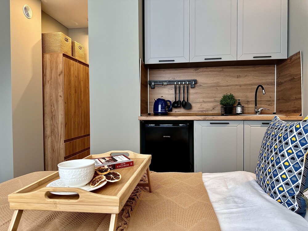 - Кухня с холодильником, плитой, микроволновкой, чайником и посудой