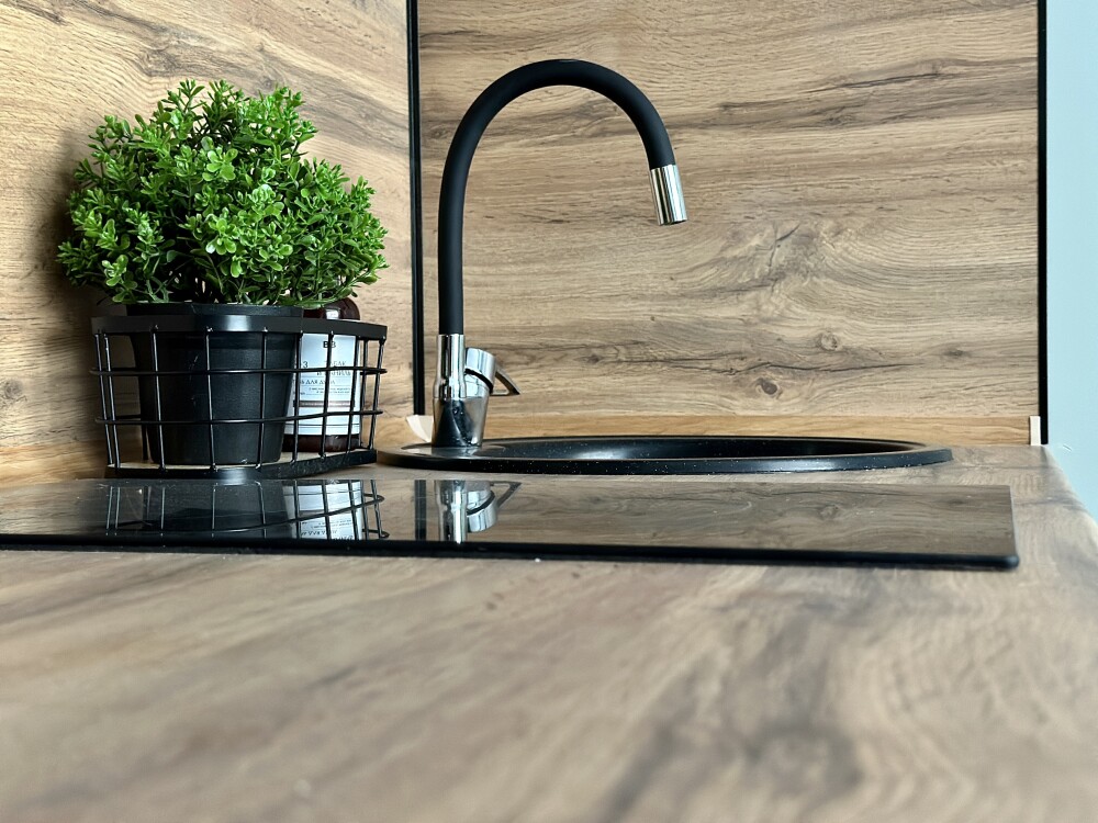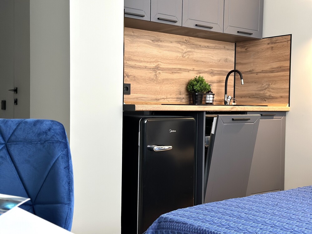 - Кухня с холодильником, плитой, микроволновкой, чайником и посудой