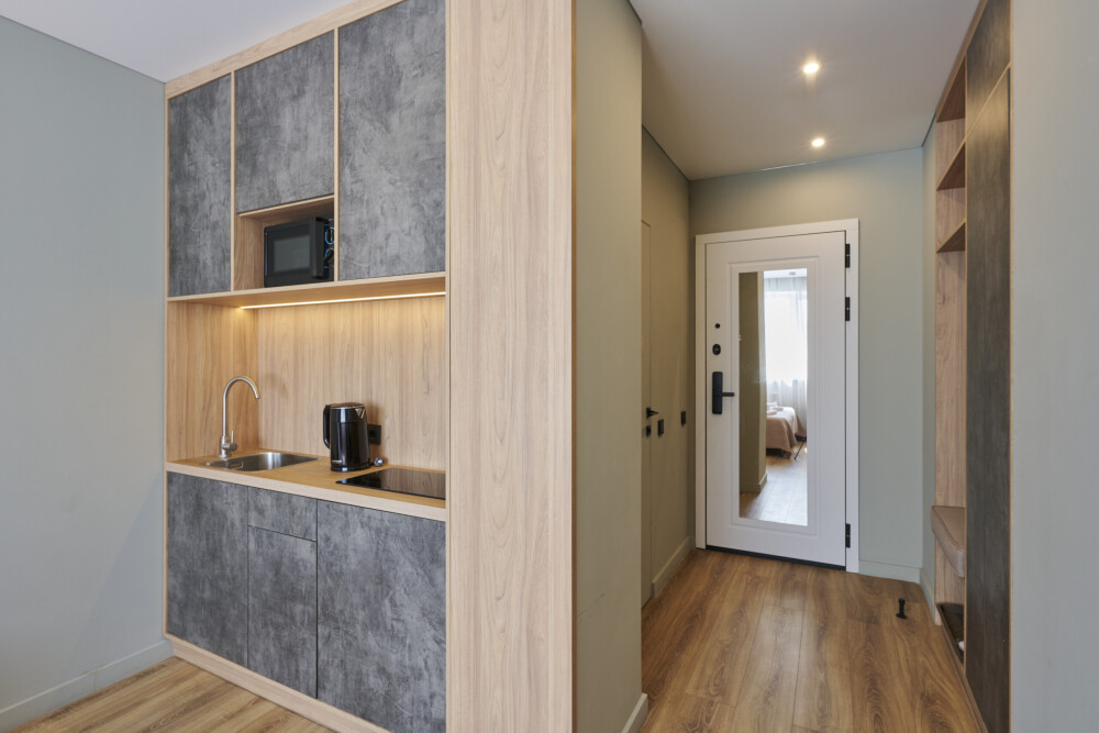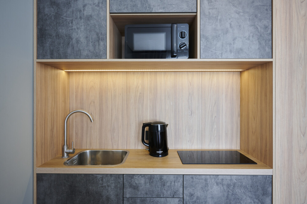 - Кухня с холодильником, плитой, микроволновкой, чайником и посудой