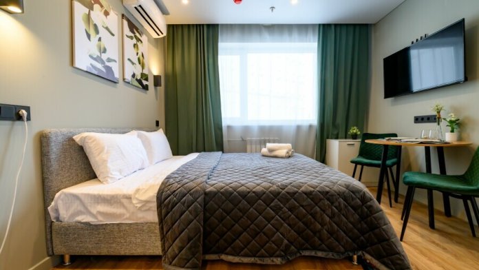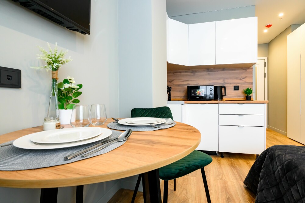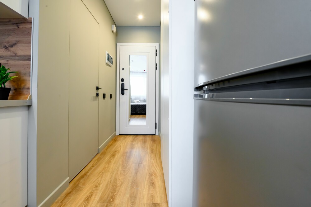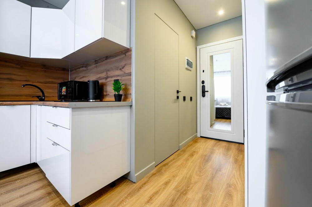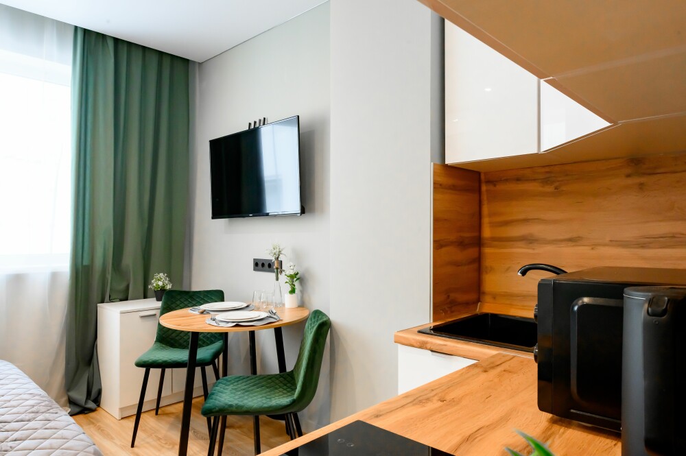 - Кухня с холодильником, плитой, микроволновкой, чайником и посудой