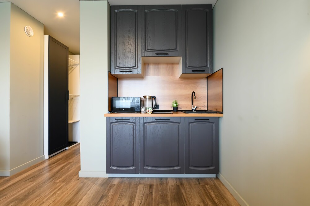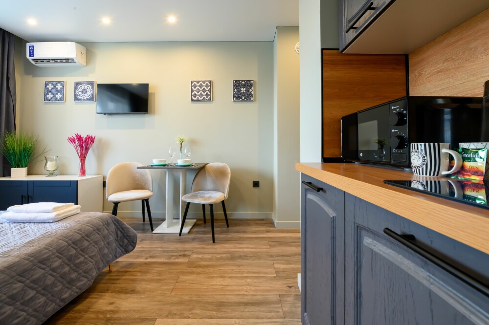 - Кухня с холодильником, плитой, микроволновкой, чайником и посудой