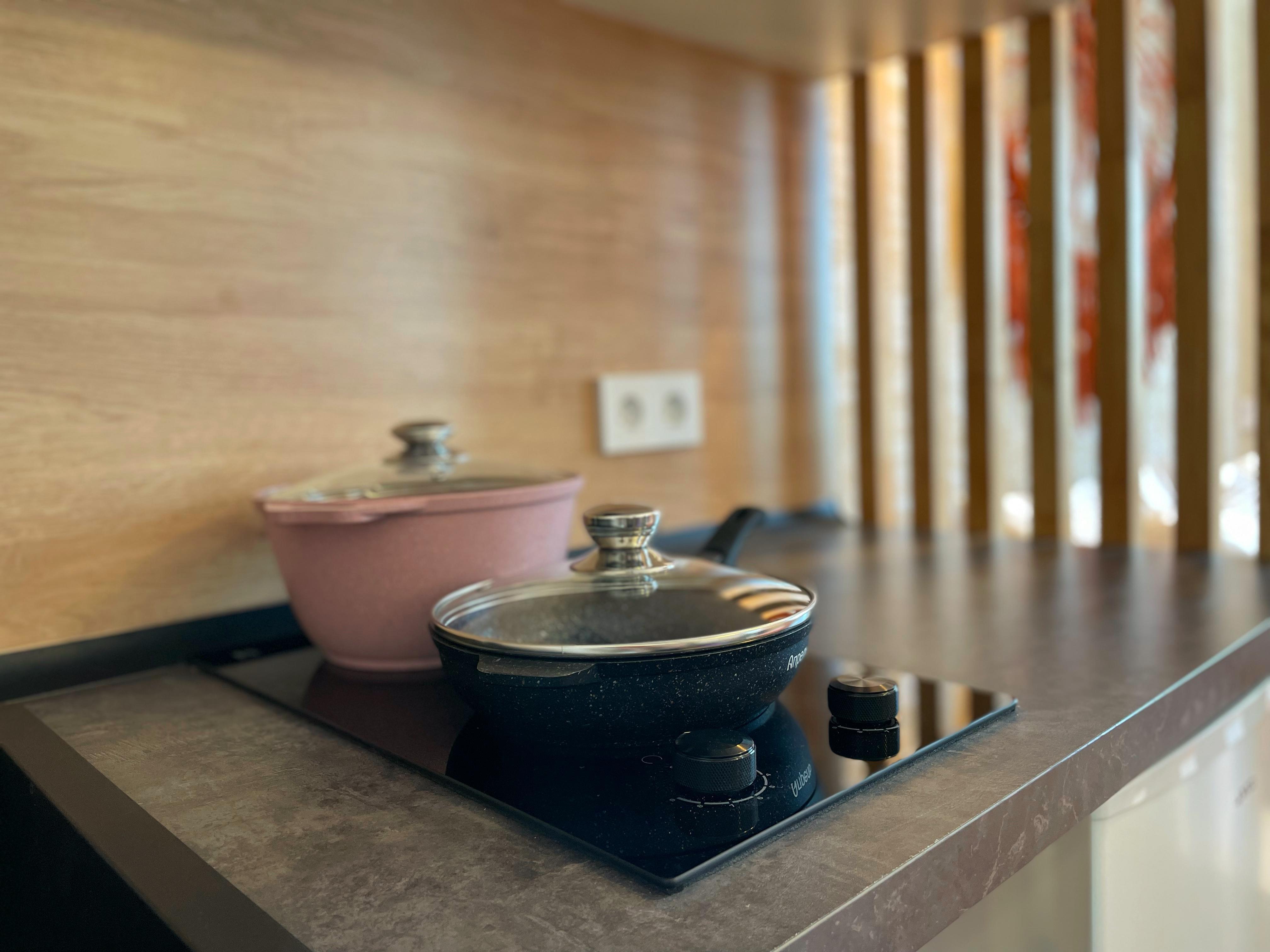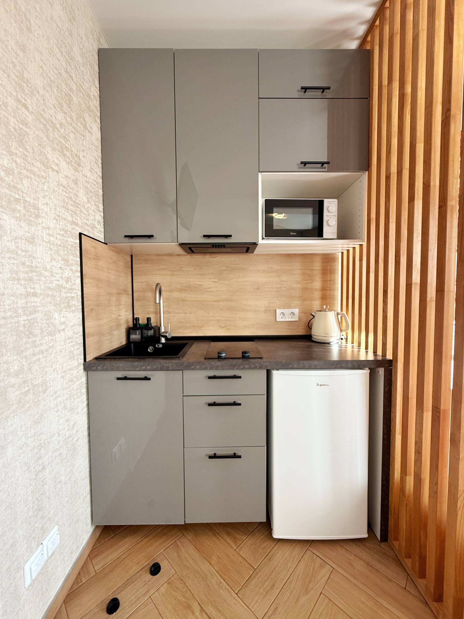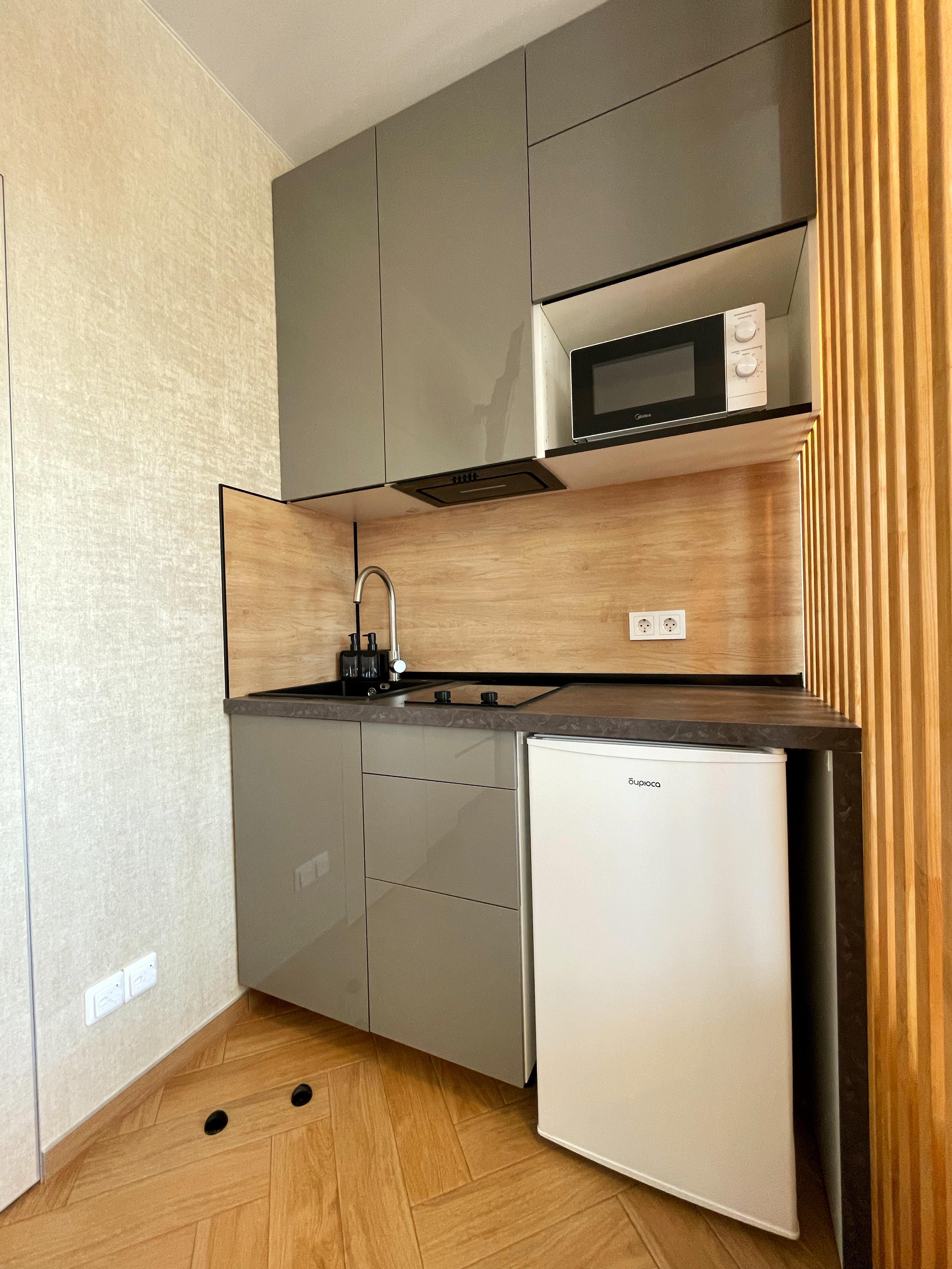 - Современная кухня с полным набором посуды, микроволновой печью и чайником – все необходимое для приготовления вкусных домашних ужинов.