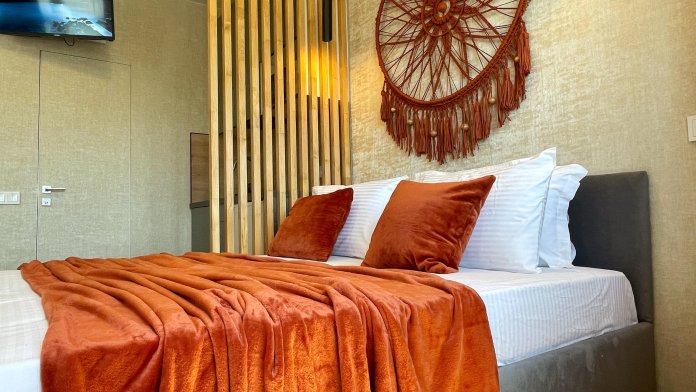 - Удобная двуспальная кровать с ортопедическим матрасом для комфортного сна и расслабления.