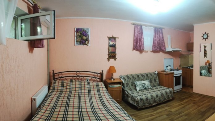 Есть кухонная зона, санузел ,кондиционер. двуспальная кровать и диванчик . во дворе есть беседка мангальная зона ,до моря 400 м