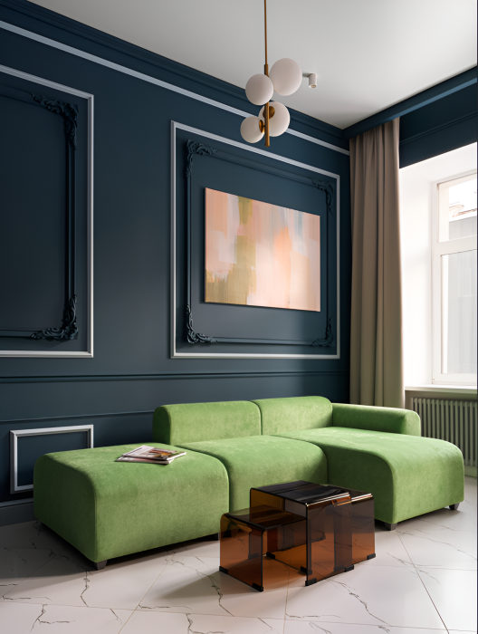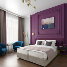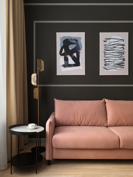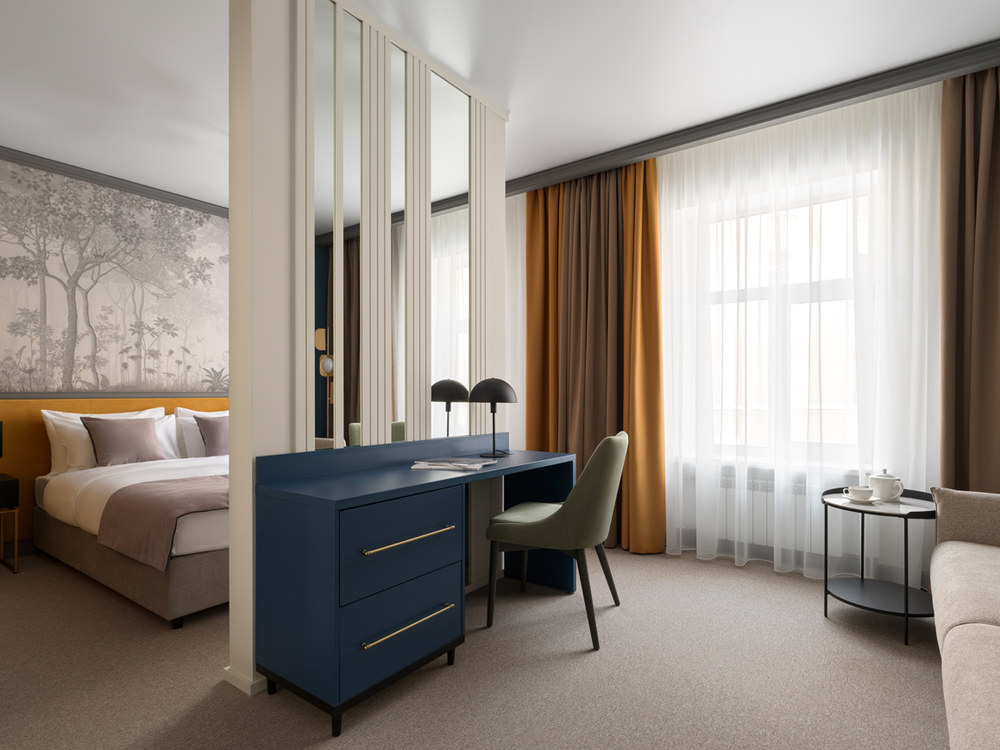 Спальное место организовано стильной двуспальной кроватью-трансформером с ортопедическим матрасом. Дополнительное место - диван. В номере есть кондиционер, сейф, стол с чайной станцией.
