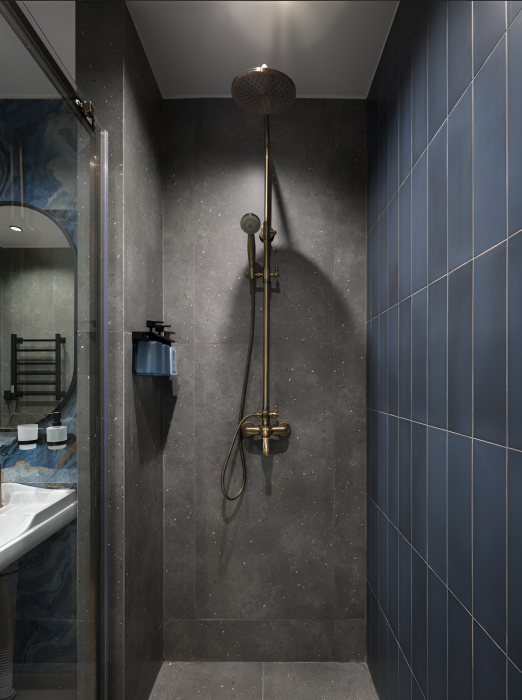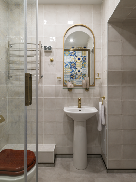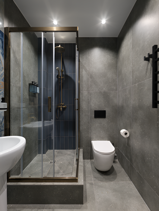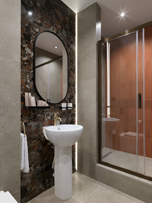 Собственная ванная комната оснащена современной душевой кабиной. В номере мягкие халаты, набор качественных косметических принадлежностей и фен.