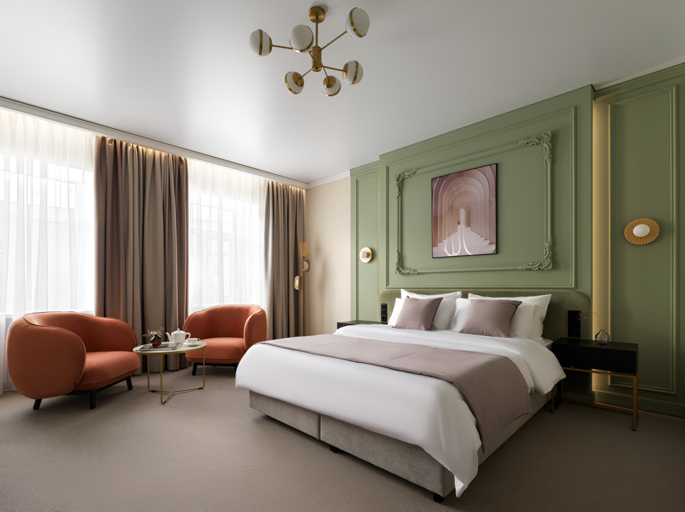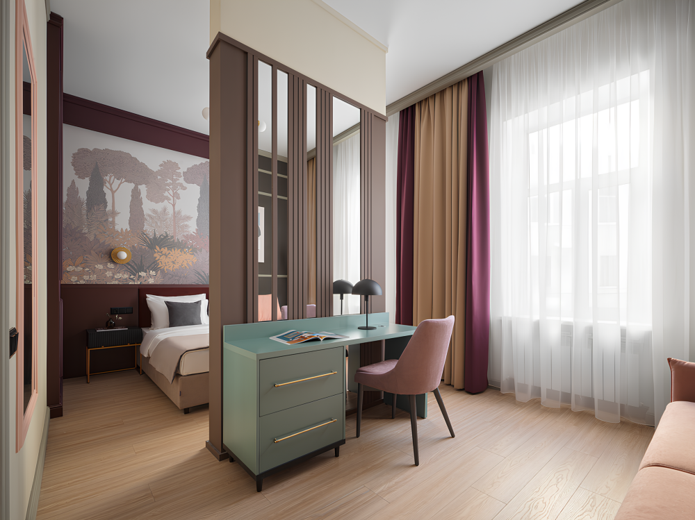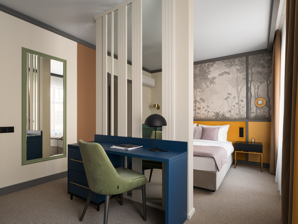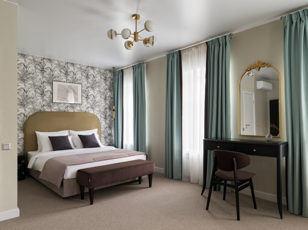 Спальное место организовано стильной двуспальной кроватью-трансформером с ортопедическим матрасом. В номере есть кондиционер, сейф, стол с чайной станцией.
