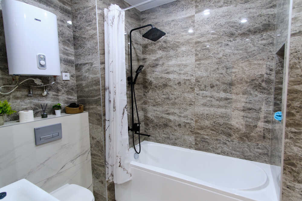 - бойлер, ванна, тропический душ, стиральная машина, фен;